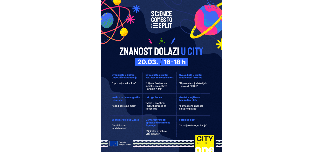 Događaj „Znanost dolazi u City“ pruža jedinstvenu priliku za upoznavanje znanosti, tehnologije i kreativnosti kroz interaktivne sadržaje namijenjene djeci, mladima i svim znatiželjnim posjetiteljima. Više informacija pročitajte na linku. Vidimo se u City Centeru One!