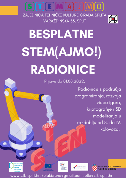 "Za sve informacije i pojedinosti o STEM(AJMO!) projektu kontaktirajte nas na broj telefona 095/355-4988, Bruna Kolak, vanjska suradnica ZTK grada Splita, voditeljica radionica ili pošaljite upit na mail kolakbruna@gmail.com", poručuju iz ZTK-a Split.