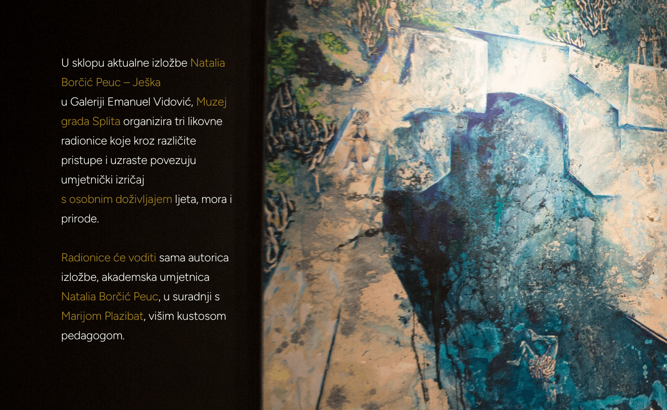 U sklopu aktualne izložbe Natalia Borčić Peuc – Ješka u Galeriji Emanuel Vidović, Muzej grada Splita tijekom ovoga tjedna organizira tri likovne radionice koje kroz različite pristupe i uzraste povezuju umjetnički izričaj s osobnim doživljajem ljeta, mora i prirode. Radionice će u srijedu i četvrtak, kroz likovne tehnike tempera i kolaža, voditi sama autorica izložbe, akademska umjetnica Natalia Borčić Peuc u suradnji s Marijom Plazibat, višim kustosom pedagogom.