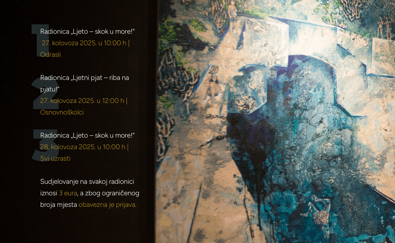 Stoga, ako ste ikada maštali o tome da vaše djelo bude izloženo u galeriji, obratite pažnju na radionice koje se redovito održavaju u Muzeju grada Splita. Ovoga puta, na sudjelovanje potaknite svoje najmlađe. Svega je nekoliko mjesta ostalo na raspolaganju za osnovnoškolce u srijedu 27. kolovoza, u 12 sati. Detaljan program svih radionica možete vidjeti u foto galeriji ili na Facebook i Instagram stranici Muzeja grada Splita.