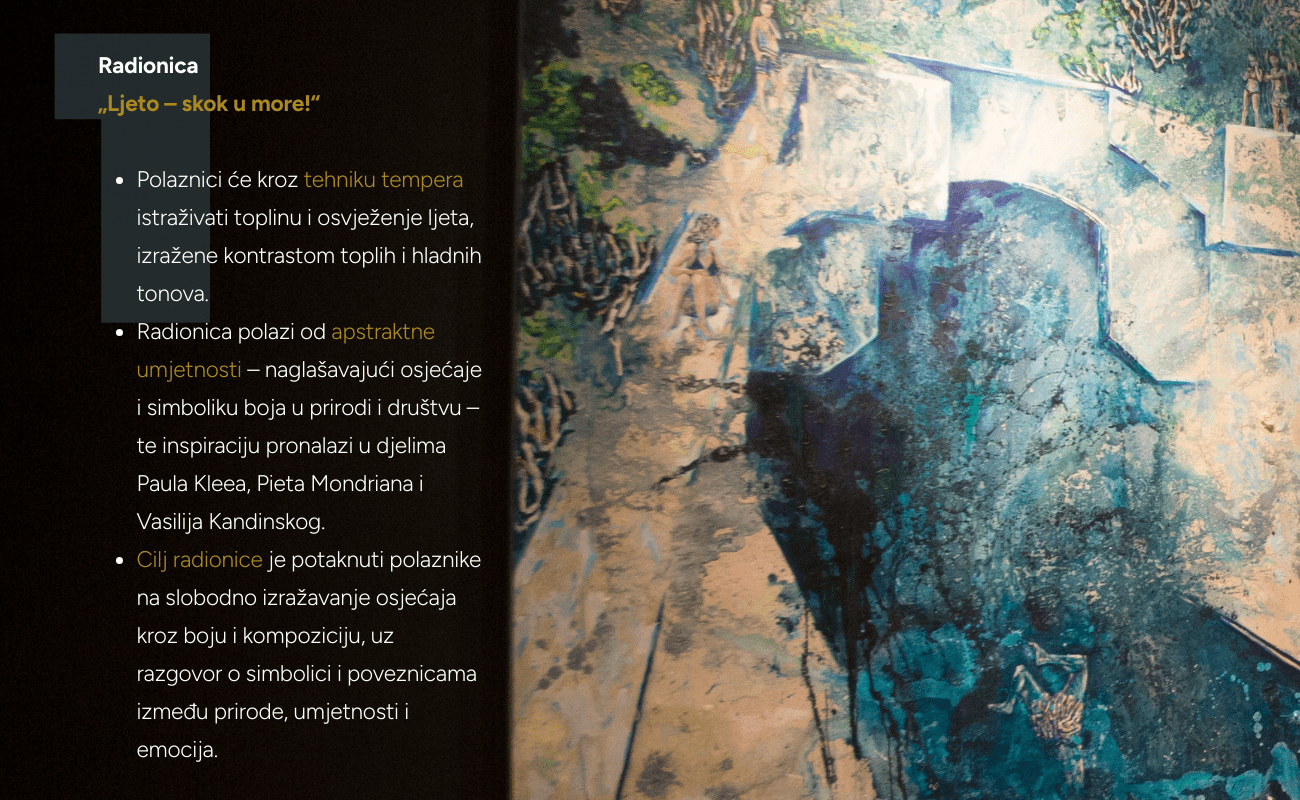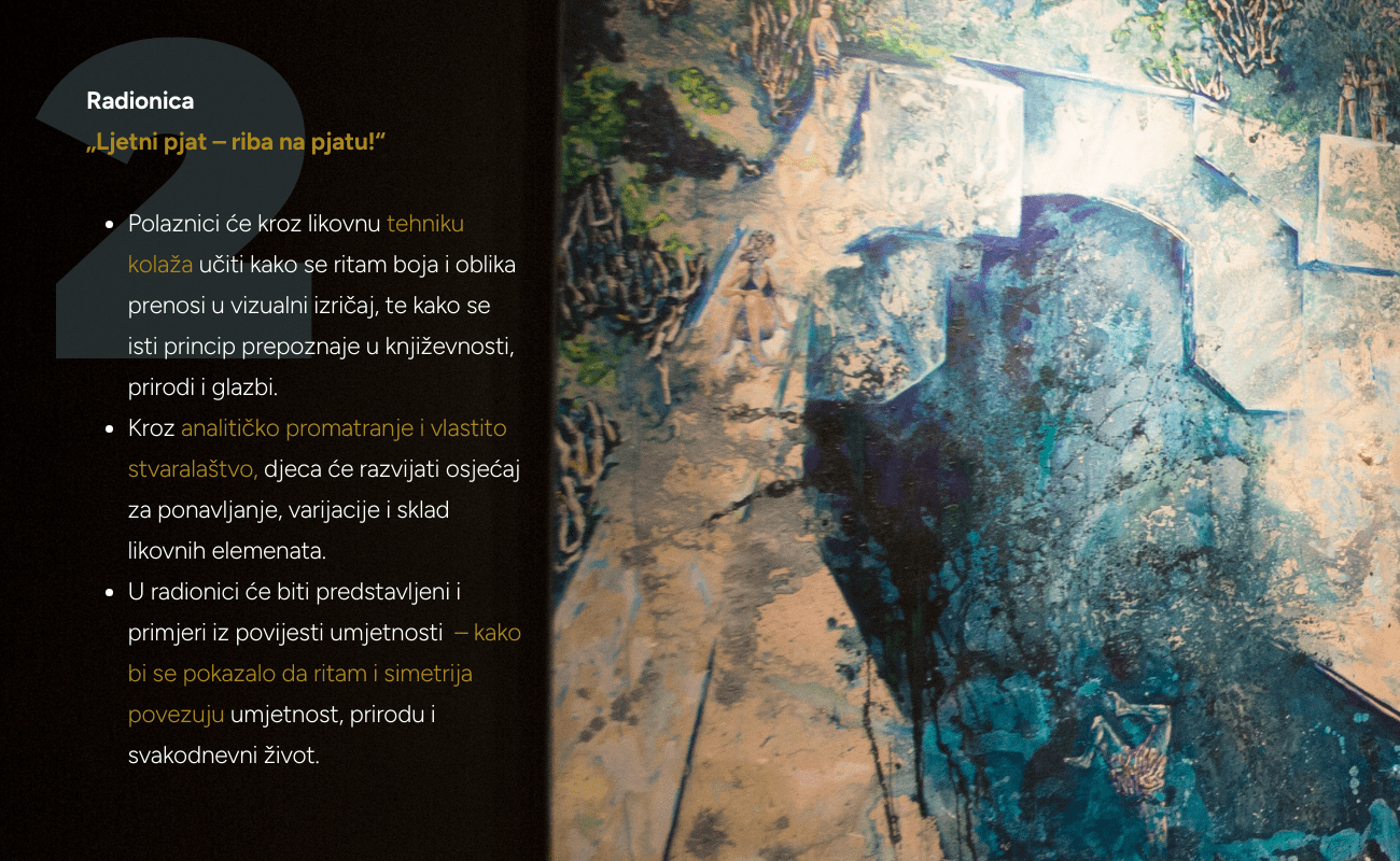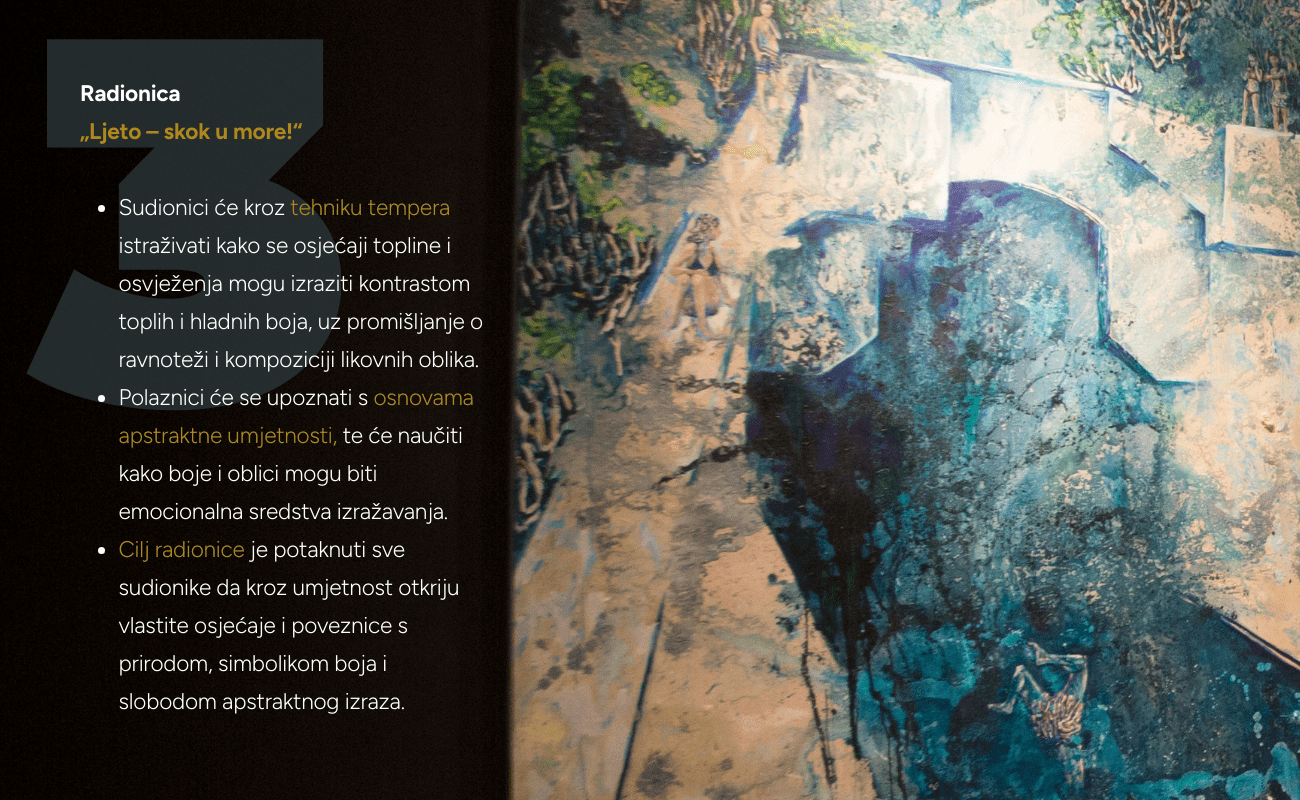 "Polaznici mogu očekivati opuštenu i veselu radionicu. Želja mi je da se zabave i opuste, ali i da nešto novo nauče te naprave kvalitetan likovni rad", naglasila je Natalia Borčić Peuc, najavljujući kako program radionica završava velikom izložbom: