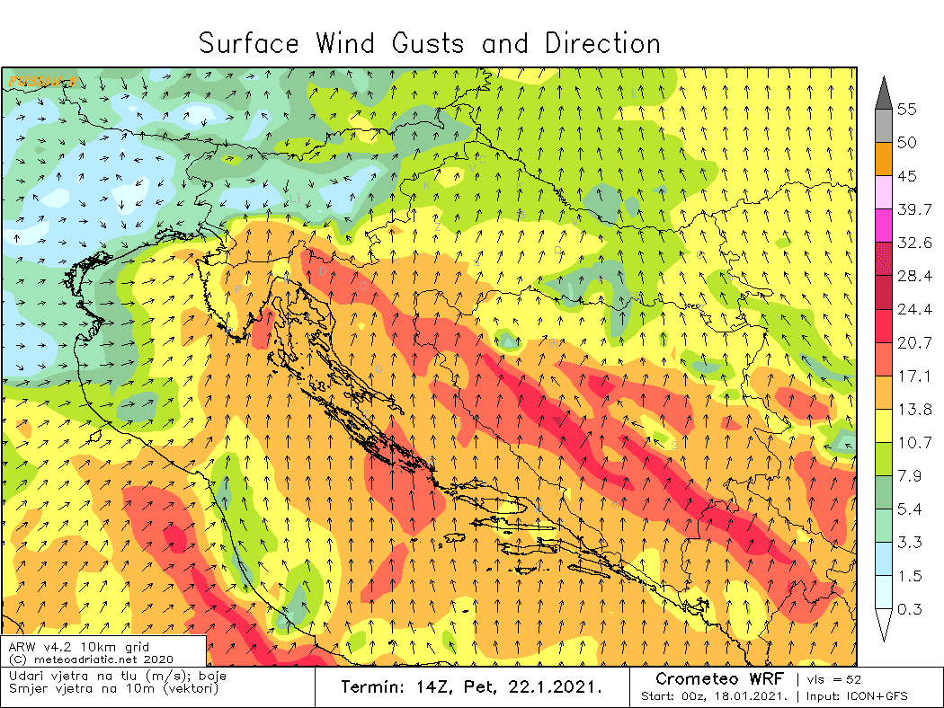 Oblačno s kišom, povremeno i pljuskovima s grmljavinom bit će u petak. Oborine će biti obilne pa će lokalno pasti preko 50 litara kiše po kvadratnom metru. U planinama izraženo topljenje snijega. Puhat će jako do vrlo jako oštro i lebić s olujnim udarima. Zbog vjetra i valova očekuju se problemi u prometu morem. Još toplije, najviše dnevne temperature od 13 do 17°C.