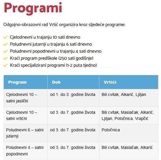 Primljeno je ove godine 235 djece, od čega je 61 jaslične, a 174 vrtićke, a prošle 40 jaslične i 125 vrtićke djece. Stavljanjem u funkciju vrtića "Nikolino" u Brnazama u crkvi Sv. Nikole oko Velike Gospe dobit će se dvije vrtićke i dvi jaslične skupine po 10 satnom dnevnom programu. Proširenjem kapaciteta postojećeg vrtića Vrapčić u Brnazama otvorit će se nova četverosatna popodnevna skupina, a nju će dobit i Vrtić Potočnica u Glavicama. U Bilom Cvitku proširenjem kapaciteta, izmještajem kuhinje, dobit će se jedna jutarnja desetosatna skupina.