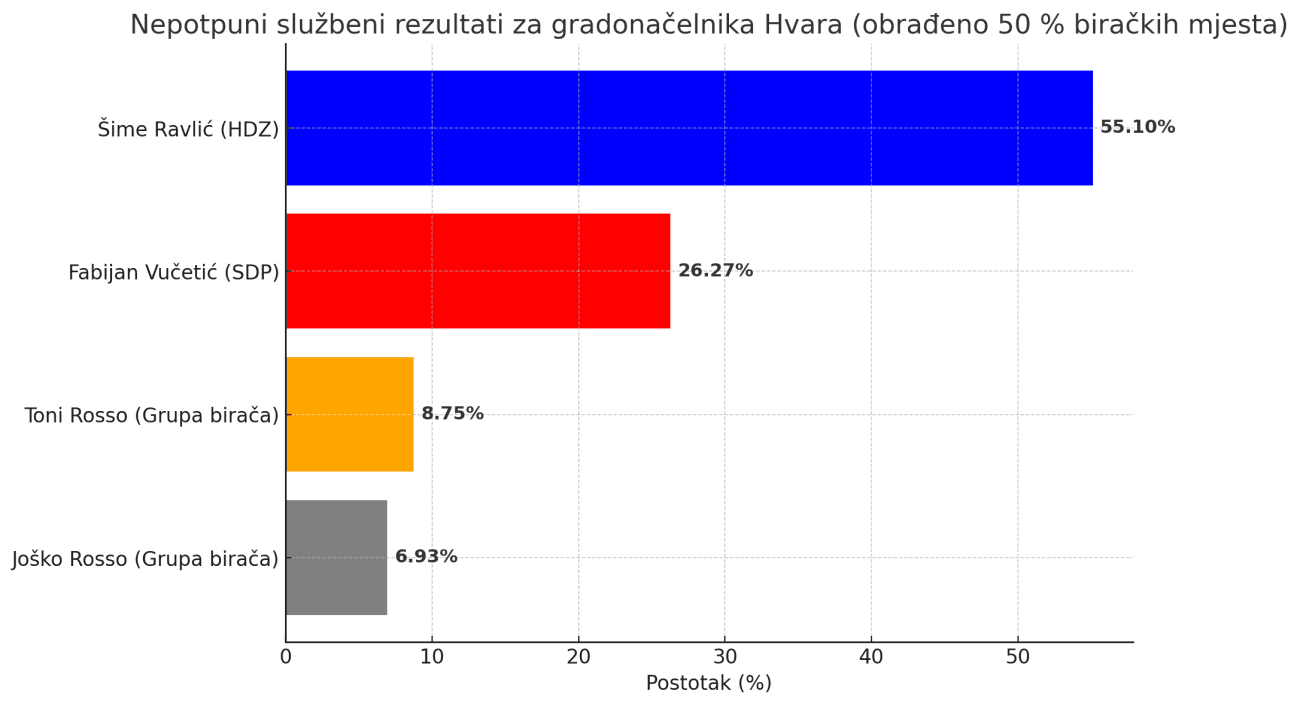 Prema službenim, ali još uvijek nepotpunim rezultatima (oko 50 posto obrađenih podataka), na izborima za gradonačelnika Grada Hvara vodi kandidat Hrvatske demokratske zajednice (HDZ) Šime Ravlić, koji je osvojio 55,10 % glasova na temelju dosad obrađenih 3 od ukupno 6 biračkih mjesta, što čini točno 50 %.