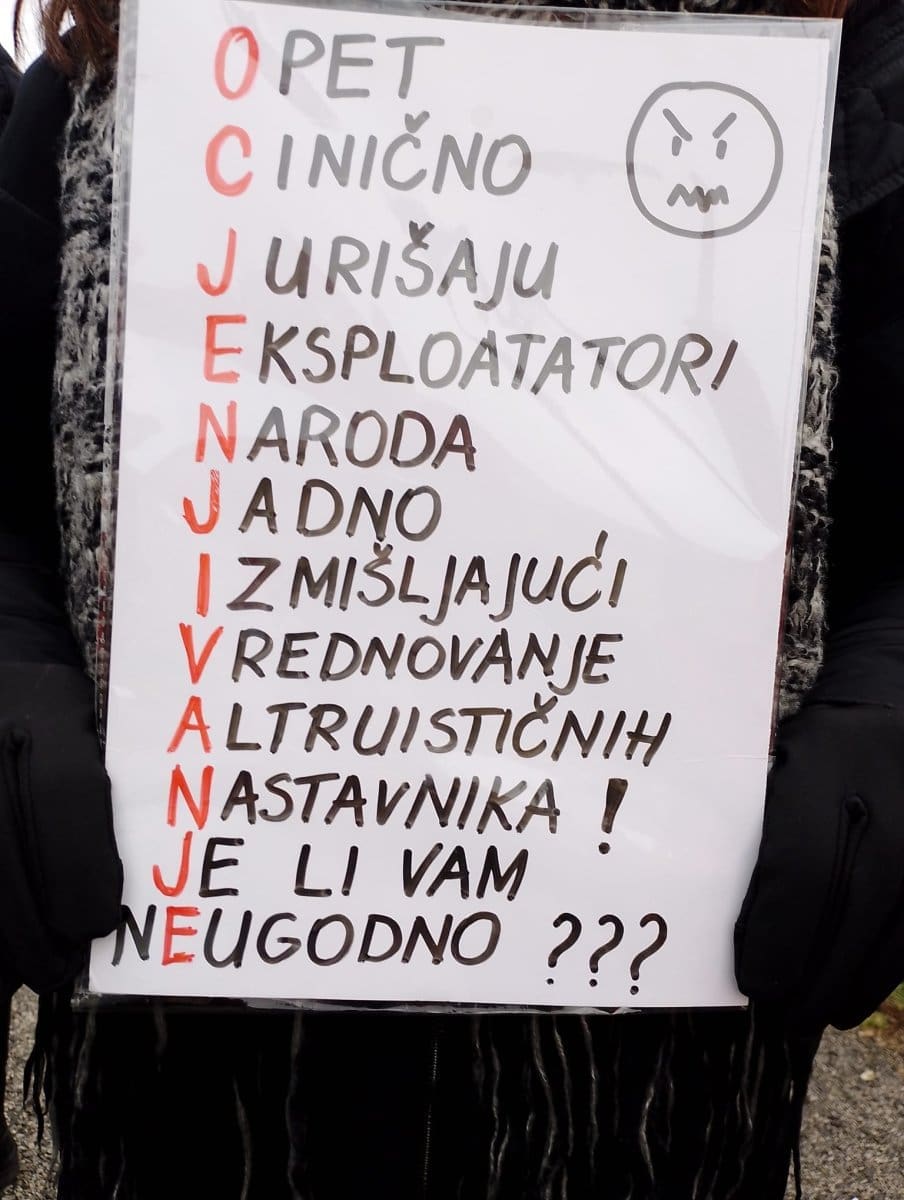 Prosvjednici su nosili transparente s porukama poput: "Ocijenite sebe, a onda mene," "Više odmah," i "Bez akcije nema reakcije," jasno izražavajući svoje nezadovoljstvo.