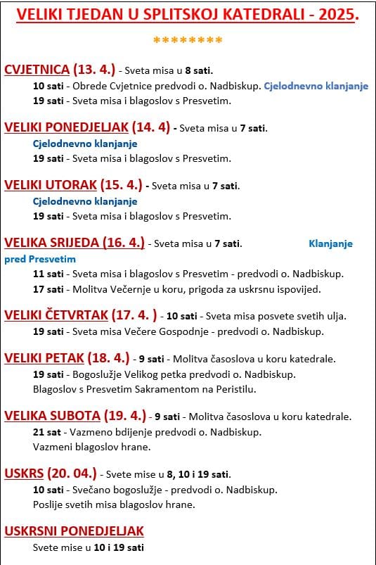 Na Veliki četvrtak, 17. travnja, nadbiskup Zdenko Križić predvodit će u 10 sati Misu posvete svetih ulja u splitskoj katedrali sv. Dujma, a u 19 sati misu Večere Gospodnje kojom počinje Vazmeno trodnevlje.