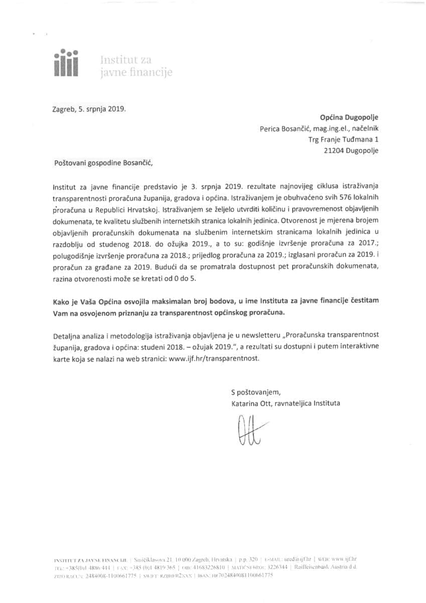- Jako nam je važno raditi naš posao odgovorno i transparentno, ipak upravljamo sa novcem svih mještana Općine Dugopolje. Za Općinu Dugopolje je velika stvar dobiti najvišu ocjenu za transparentnost pogotovo jer smo do prije par godina imali ocjenu nula i bili smo među najmanje transparentnim općinama u Hrvatskoj po kriterijima Instituta, a sada smo već drugu godinu zaredom napravili tolike pomake da smo dobili najvišu ocjenu pet.