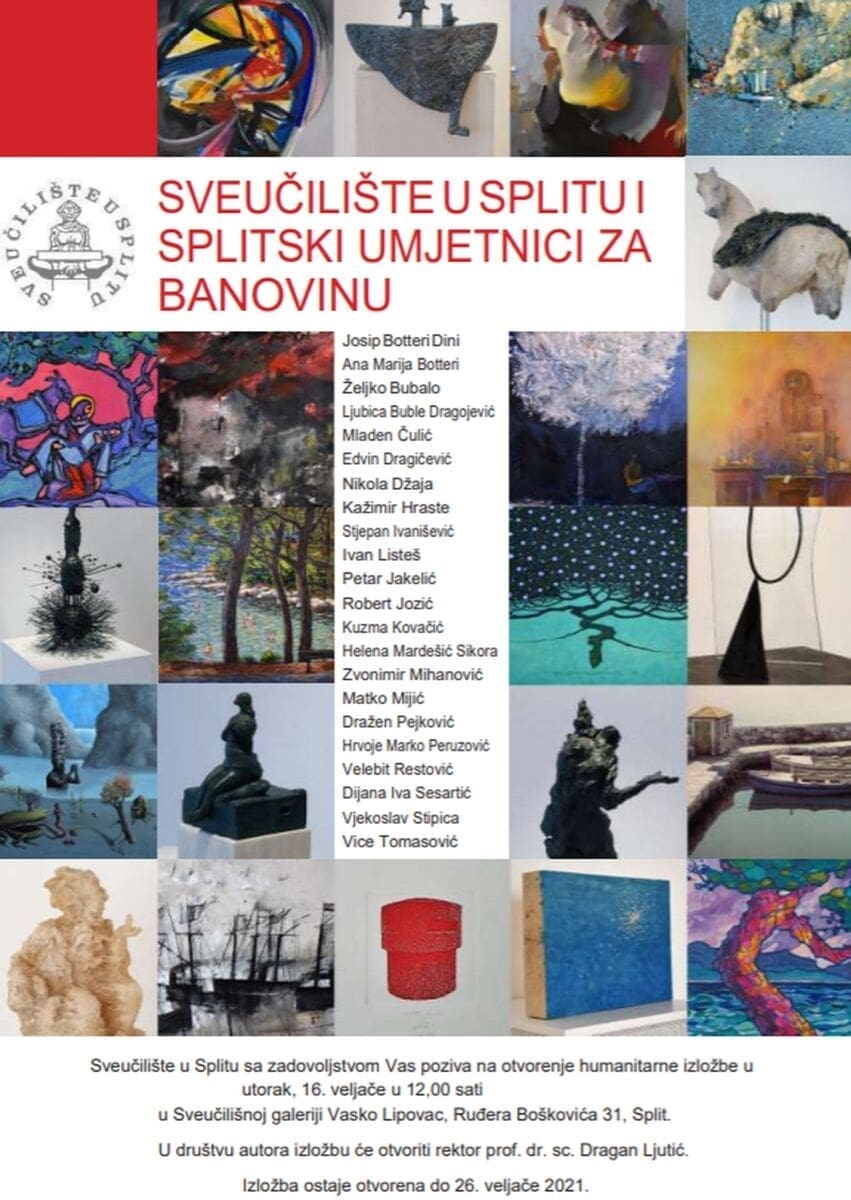 Humanitarna izložba pod nazivom „Sveučilište u Splitu i splitski umjetnici zajedno za Banovinu“ otvorit će se u utorak 16. veljače, s početkom u 12 sati u Sveučilišnoj galeriji „Vasko Lipovac“, R. Boškovića 31. Izložbu će otvoriti rektor splitskog sveučilišta prof. dr. sc. Dragan Ljutić.
