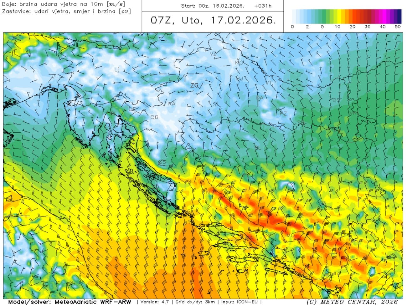 U utorak u prvom dijelu dana oblačno, malo kiše moguće je još u noći, u Dalmatinskoj zagori i susnježice. Od jutra prestanak oborina koji će posljednje zahvatiti jug Dalmacije. Popodne postupno razvedravanje. Ujutro će puhati jaka tramontana, na moru će imati olujne udare, osobito prema otvorenom. Najviše dnevne temperature od 8 do 14°C.