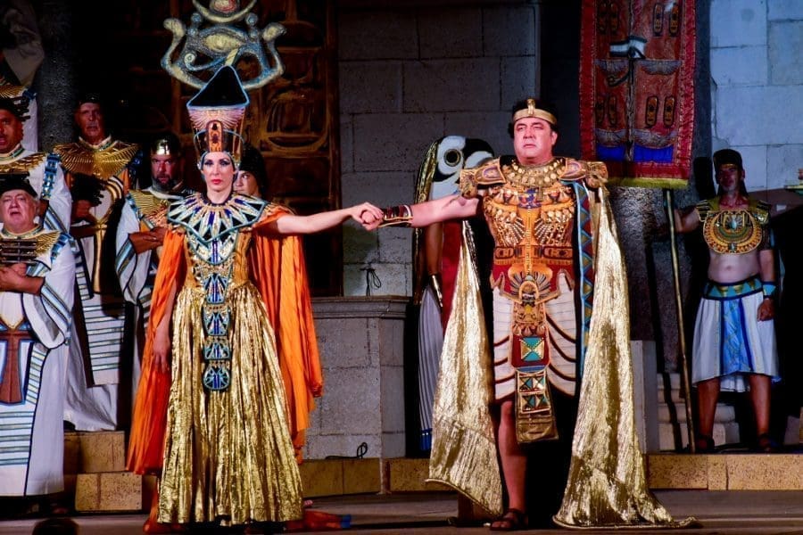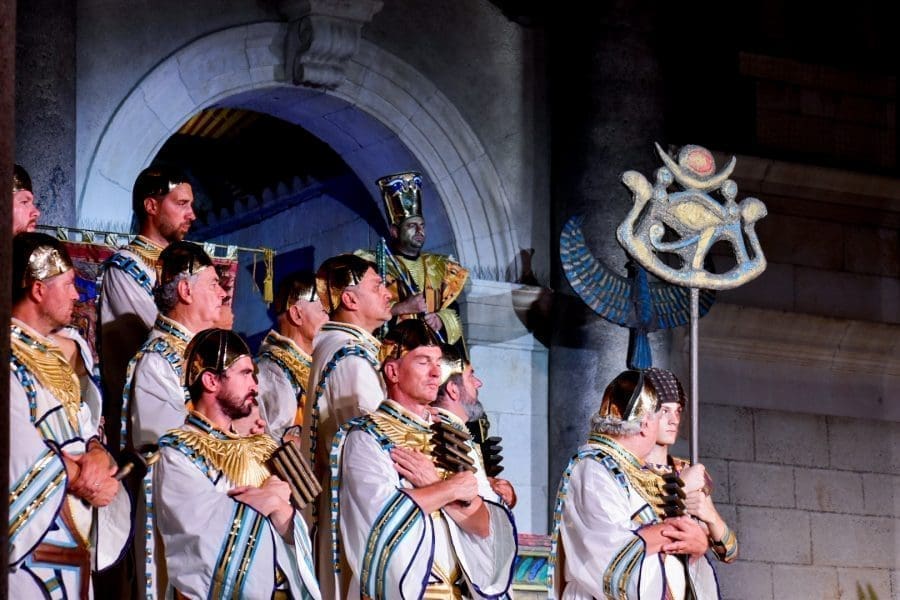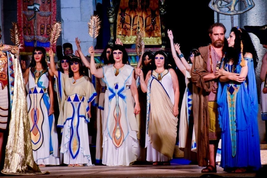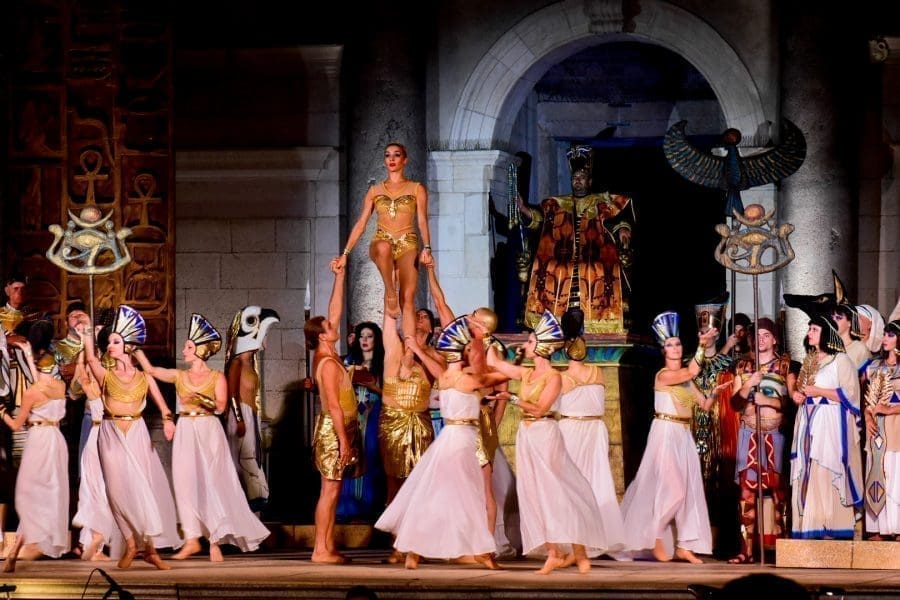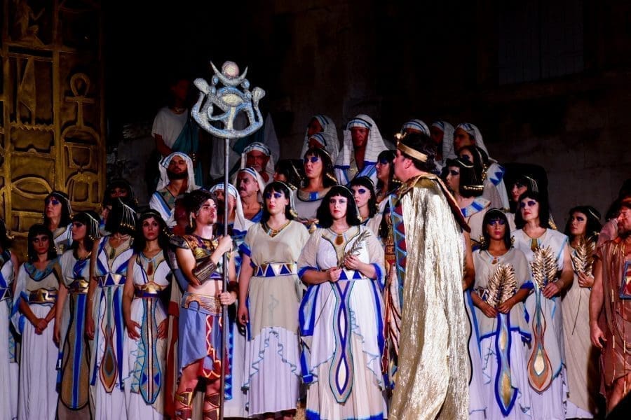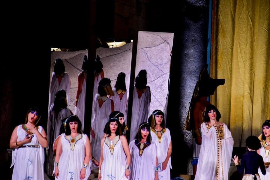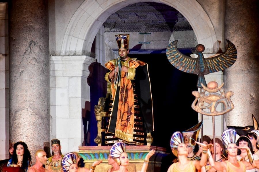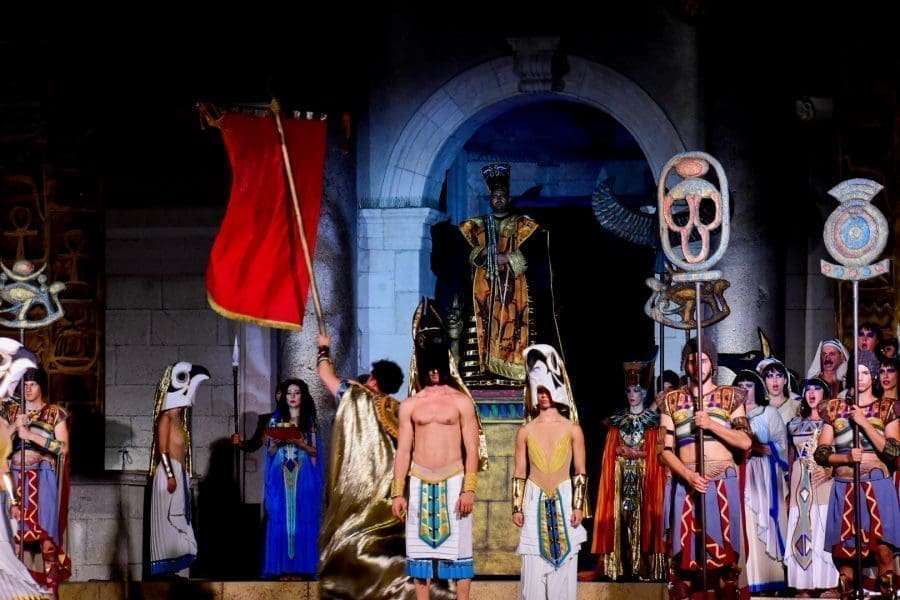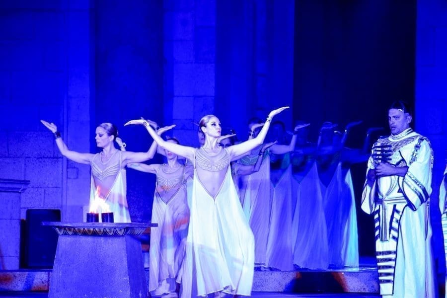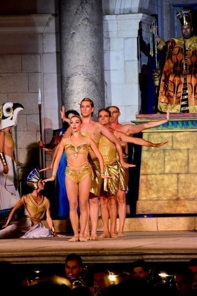 Svečani doček pobjedničke vojske operni je trenutak par excellence – od izvrsnih trubača preko fantastičnih scenografskih rješenja Slavena Raosa (preobrazba monumantalnih stupova i stubišta, pokretno prijestolje, uvjerljivi rekviziti s egipatskim simbolima poput ankha), a posebno je dojmljiv nastup članova baletnog ansambla. Matea Milas djelovala je kao egipatska božica, oduševila je gracioznošću i interpretativnom snagom u paru sa Silviuom Tanaseom, u moćnoj koreografiji Oskara Harmoša i Dinka Bogdanića koja je „pojela“ cijelu pozornicu. Juraj Zigman svojim je kostimima pokazao da se u „Aidi“ pazilo baš na svaki detalj – divno je što je umjetnik uspio uhvatiti duh vremena, ispoštovati boje i uzorke staroga Egipta, a istovremeno zadržati svoj touch, čvrste strukture (posebno u korzetiranoj haljini Amneris u posljednjem činu) i veličanstvene linije plašta. Maske Anubisa (boga s glavom šakala) i Horusa (boga s glavom sokola) u kombinaciji sa scenografijom koja izgleda kao da je doslovce niknula iz peristilskog kamena i odličnim oblikovanjem svjetla Zorana Mihanovića u gledatelju ostavljaju dojam kao da ga je vremeplov prebacio u Egipat.