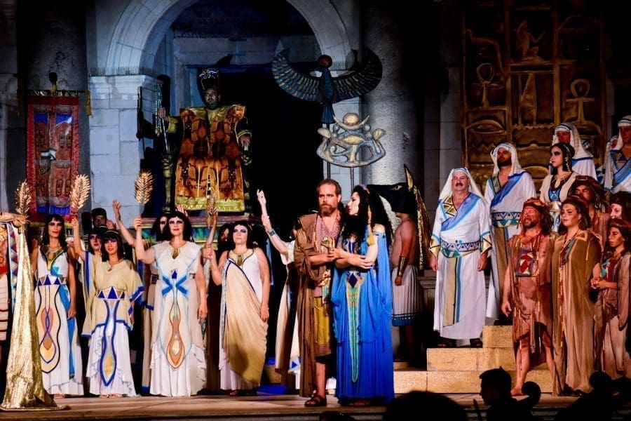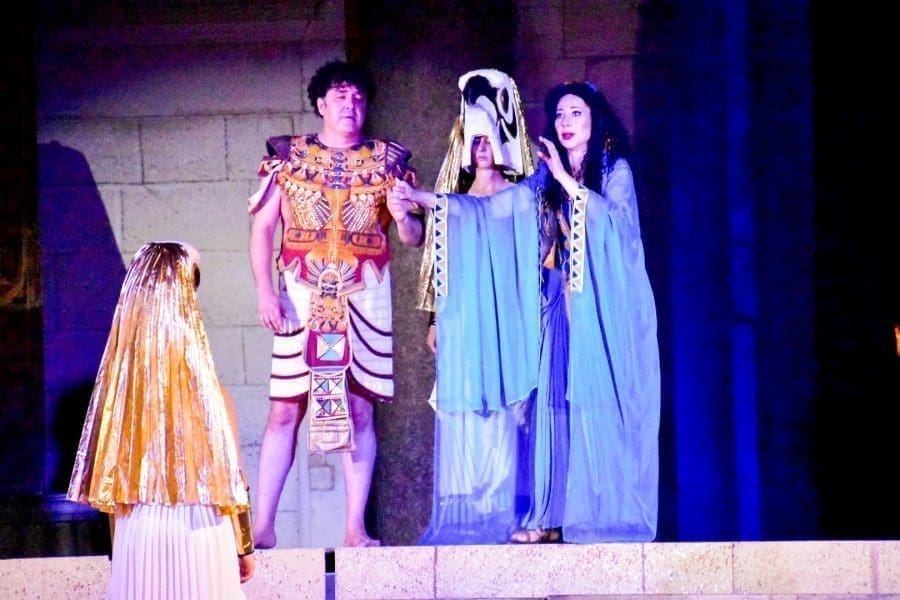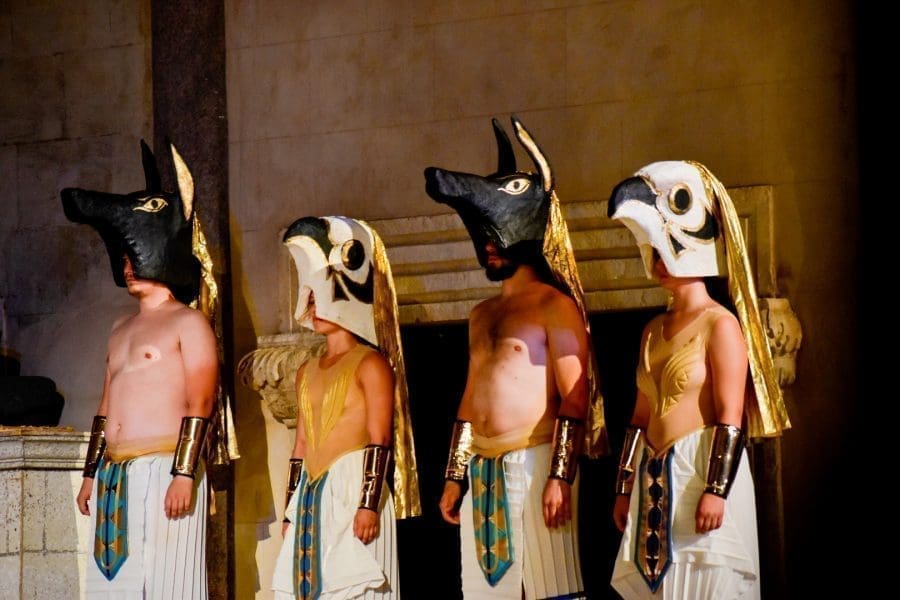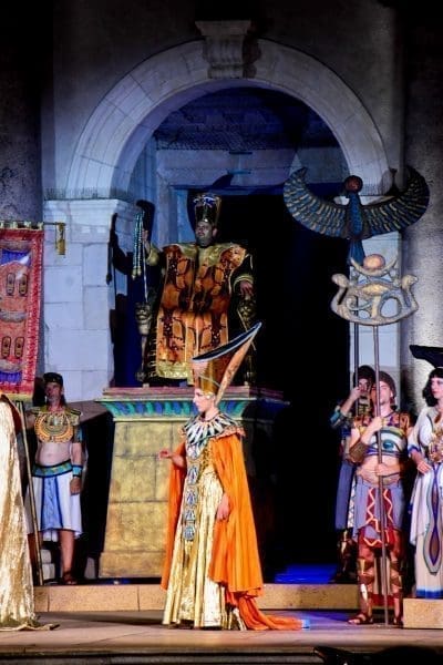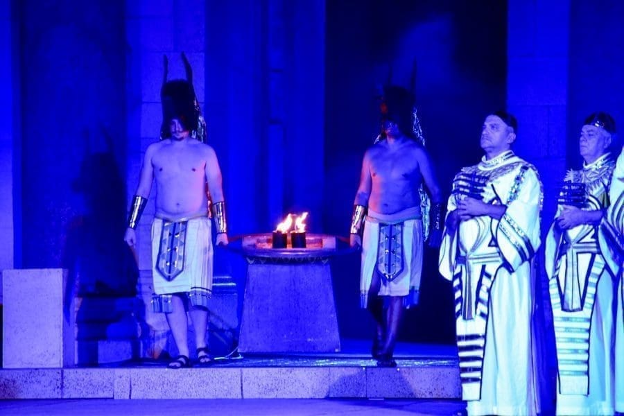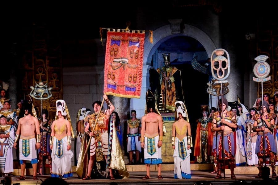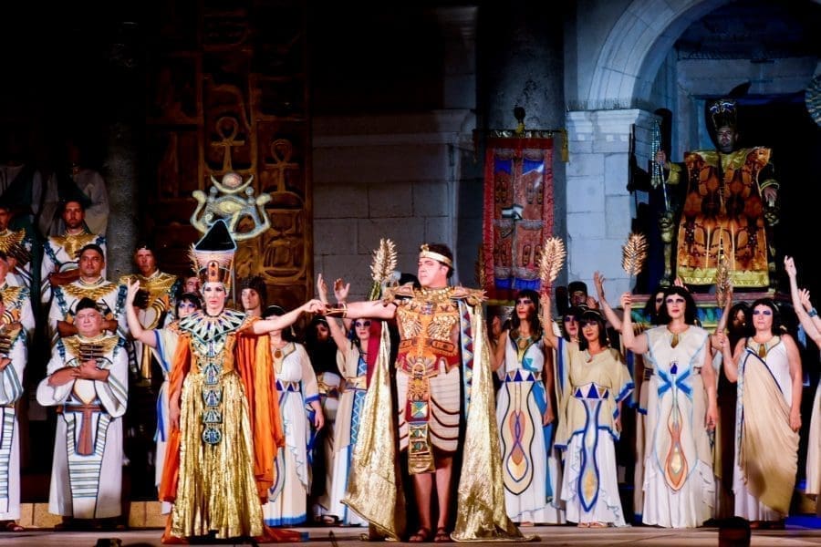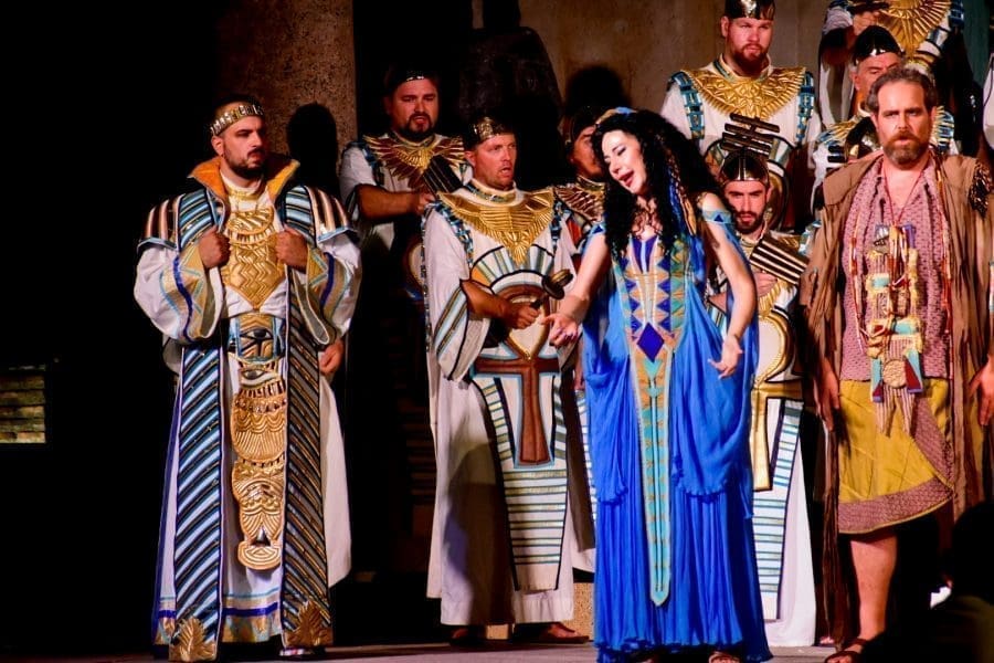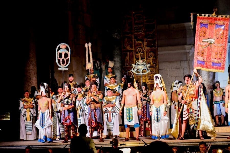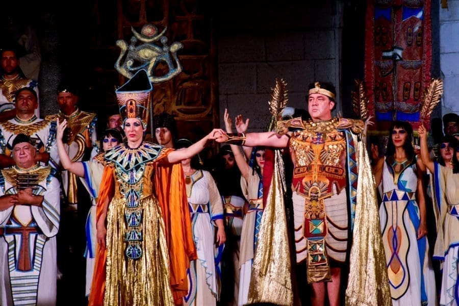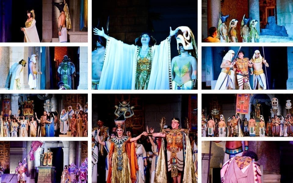 Svečani doček pobjedničke vojske operni je trenutak par excellence – od izvrsnih trubača preko fantastičnih scenografskih rješenja Slavena Raosa (preobrazba monumantalnih stupova i stubišta, pokretno prijestolje, uvjerljivi rekviziti s egipatskim simbolima poput ankha), a posebno je dojmljiv nastup članova baletnog ansambla. Matea Milas djelovala je kao egipatska božica, oduševila je gracioznošću i interpretativnom snagom u paru sa Silviuom Tanaseom, u moćnoj koreografiji Oskara Harmoša i Dinka Bogdanića koja je „pojela“ cijelu pozornicu. Juraj Zigman svojim je kostimima pokazao da se u „Aidi“ pazilo baš na svaki detalj – divno je što je umjetnik uspio uhvatiti duh vremena, ispoštovati boje i uzorke staroga Egipta, a istovremeno zadržati svoj touch, čvrste strukture (posebno u korzetiranoj haljini Amneris u posljednjem činu) i veličanstvene linije plašta. Maske Anubisa (boga s glavom šakala) i Horusa (boga s glavom sokola) u kombinaciji sa scenografijom koja izgleda kao da je doslovce niknula iz peristilskog kamena i odličnim oblikovanjem svjetla Zorana Mihanovića u gledatelju ostavljaju dojam kao da ga je vremeplov prebacio u Egipat.
