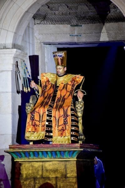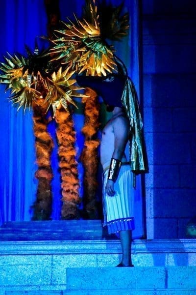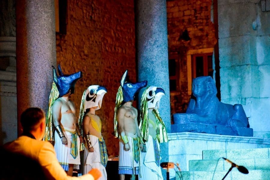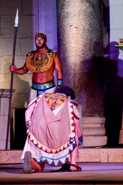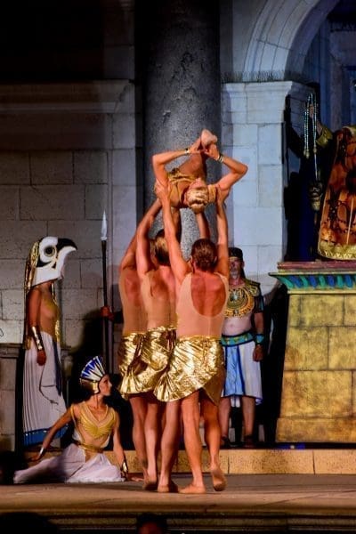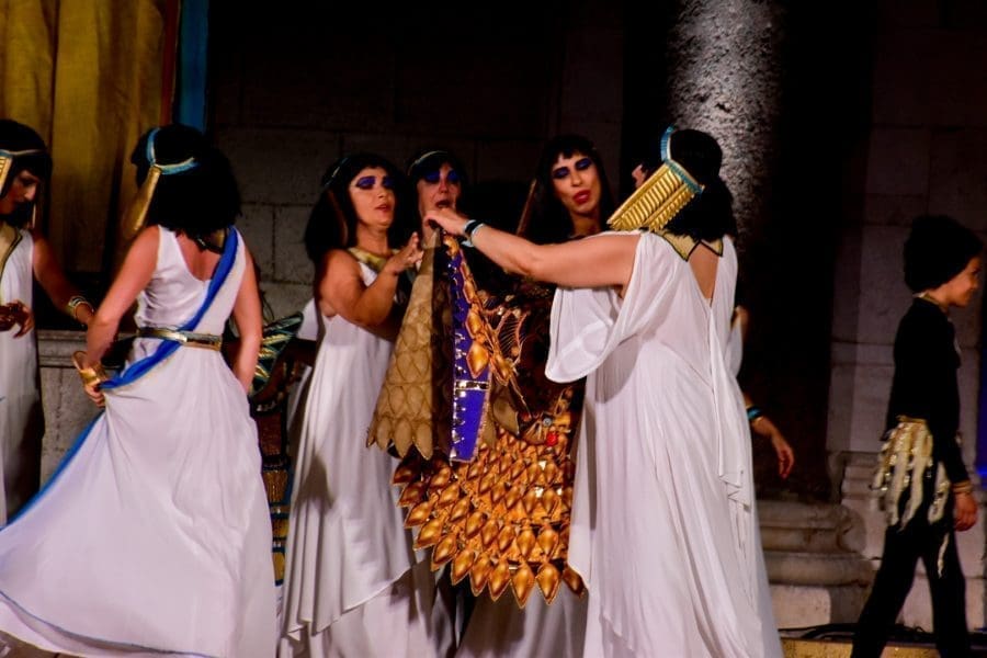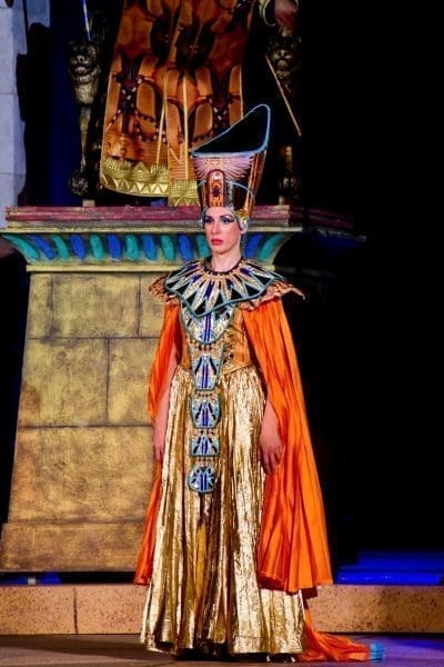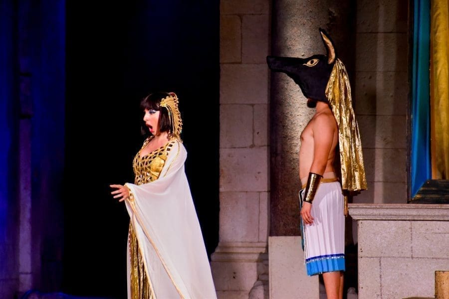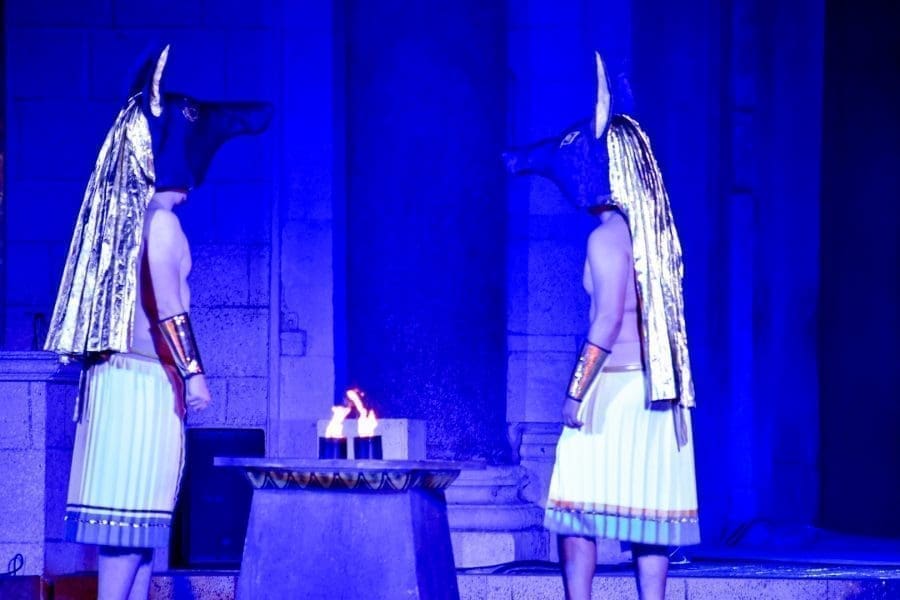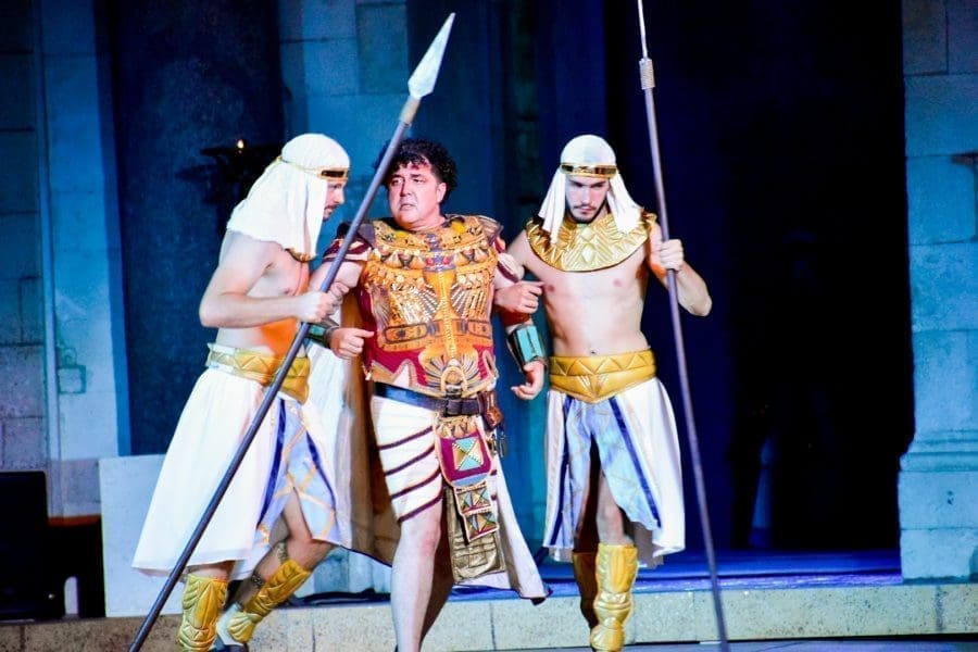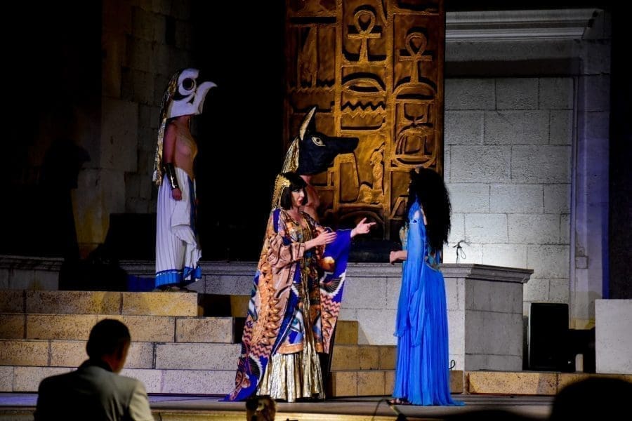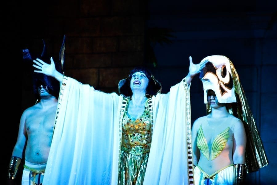Svečani doček pobjedničke vojske operni je trenutak par excellence – od izvrsnih trubača preko fantastičnih scenografskih rješenja Slavena Raosa (preobrazba monumantalnih stupova i stubišta, pokretno prijestolje, uvjerljivi rekviziti s egipatskim simbolima poput ankha), a posebno je dojmljiv nastup članova baletnog ansambla. Matea Milas djelovala je kao egipatska božica, oduševila je gracioznošću i interpretativnom snagom u paru sa Silviuom Tanaseom, u moćnoj koreografiji Oskara Harmoša i Dinka Bogdanića koja je „pojela“ cijelu pozornicu. Juraj Zigman svojim je kostimima pokazao da se u „Aidi“ pazilo baš na svaki detalj – divno je što je umjetnik uspio uhvatiti duh vremena, ispoštovati boje i uzorke staroga Egipta, a istovremeno zadržati svoj touch, čvrste strukture (posebno u korzetiranoj haljini Amneris u posljednjem činu) i veličanstvene linije plašta. Maske Anubisa (boga s glavom šakala) i Horusa (boga s glavom sokola) u kombinaciji sa scenografijom koja izgleda kao da je doslovce niknula iz peristilskog kamena i odličnim oblikovanjem svjetla Zorana Mihanovića u gledatelju ostavljaju dojam kao da ga je vremeplov prebacio u Egipat.