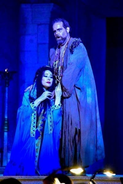 Nositeljice radnje i zvijezde izvedbe, Irena Parlov i Alessandra di Giorgio, hrabro su se nosile s težinom svojih dionica, u nižim lagama jačina tona djelomično se gubila u srazu s orkestrom, ali to ne umanjuje sjajan opći dojam i posebno izrazitu glumačku umješnost u njihovim izravnim sukobima. Gledatelj ne mora znati riječi talijanskoga, a iz njihove se mimike, gestikulacije i pametno dozirane dinamike moglo iščitati više nego iz libreta. Božo Župić bio je izuzetno uvjerljiv kao egipatski kralj, a Mate Akrap kao Ramfis sjajno je interpretirao sve osobito teške i zlokobne trenutke ratnih spletkarenja i odbijanja milosti prema Aidi. Posebne čestitke zaslužuje 19-godišnji Lovre Gujinović, jedan od najmlađih peristilskih debitanata koji se iskazao kao Glasnik, a fantastični Elia Fabbian opet je oduševio svojim moćnim vokalom koji odgovara grandioznoj ulozi oca-borca koji je rastrgan između ratne zadaće i boli zbog kćerine zabranjene ljubavi. Njegov je duet s Aidom udžbenički primjer – Fabbian ne odlazi u galamu i afektiranje da bio ostvario deklamacijski učinak, a di Giorgio na njegove riječi odgovara tiho, ponizno i molećivo – no pritom ne pjevački inferiorno, nego sukladno ulozi slomljene kćeri i partnerice.