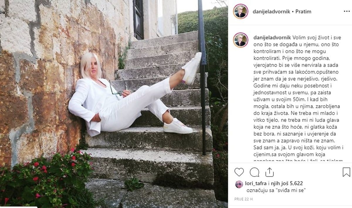 "Volim svoj život i sve ono što se događa u njemu, ono što kontroliram i ono što ne mogu kontrolirati. Prije mnogo godina, vjerojatno bi se više nervirala a sada sve prihvaćam sa lakoćom, opušteno jer znam da je sve nerješivo, rješivo. Godine mi daju neku posebnost i jednostavnost u svemu, pa zaista uživam u svojim 50-ima. I kad bih mogla, ostala bih u njima, zarobljena do kraja života. Ne treba mi mlado i vitko tijelo, ne treba mi ni luda glava koja ne zna što hoće, ni glatka koža bez bora, ni saznanje i uvjerenje da sve znam a zapravo ništa ne znam. Sad sam ja, ja. U svoj koži, koju volim i cijenim, sa svojom glavom koja napokon zna što hoće i želi, s tijelom kojeg volim i poštujem jer me služi najbolje što može. Najvažnije od svega je MIR, mala riječ a toliko moćna, koja sve to drži u jednom balansu. Naravno, tu je i zdravlje. To me čini zadovoljnom i sretnom ženom, prijateljicom, majkom, bakom. Veselim se novoj bebuši koja će ući u naše živote, bit će baš veselo i uzbudljivo", napisala je Danijela na Instagramu.