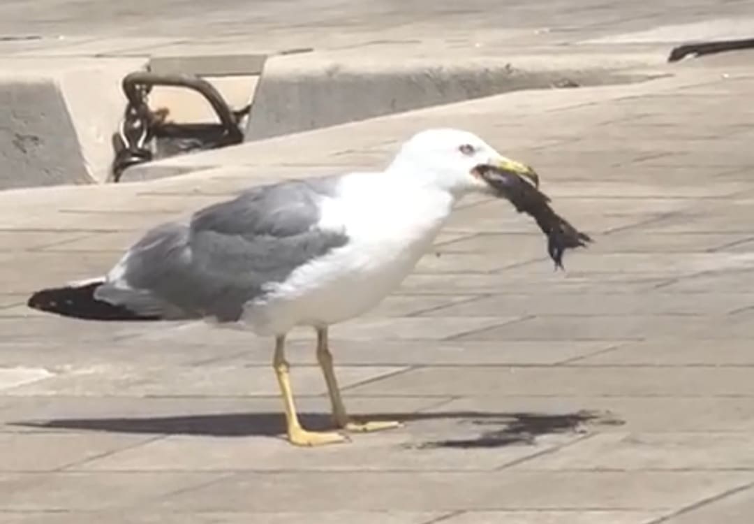 Naime, galeb je u lučici u "roku keks" hlapljivo pojeo mekušca. Čini se kako je bio strašno gladan.