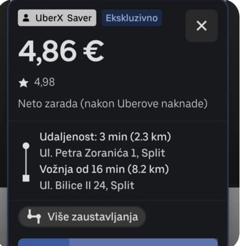 "Neka se međusobno dogovore i odbijaju vožnje, al eto netko će uvijek tit radit i to je to. Ja ne znam odakle vade ove preniske cijene jer je mene jednom od spinuta do jokera došlo 6€, kasnila san pa sam eto dala, do Solina sam plaćala redovito više od 10€ kad sam morala ić raditi", komentira druga Splićanka.