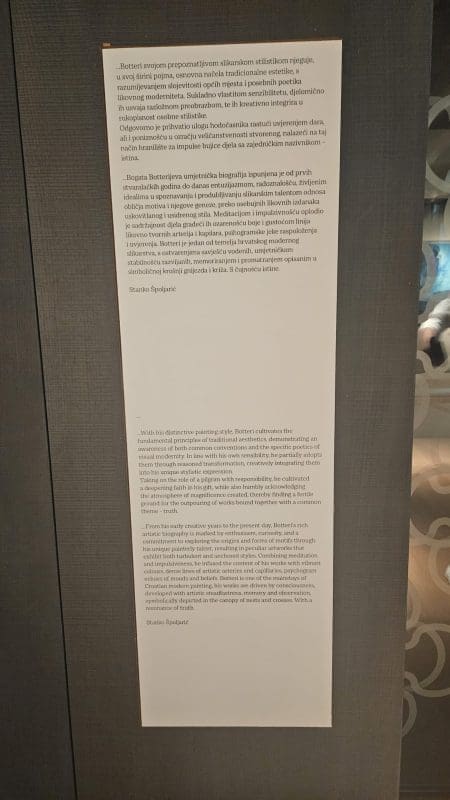 U srijedu navečer se kulturni Split okupio na otvaranju izložbe akademskog slikara Josipa Botterija Dinija pod nazivom "Retrospektiva". Izložba je otvorena u staroj Gradskoj vijećnici na splitskoj Pjaci. Zbog obima, izložba je postavljena i u prostorima HAZU-a u palači Milesi.