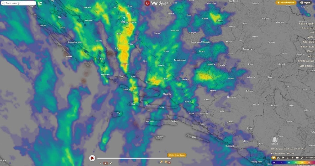Do 23 sata oborina u južnoj Dalmaciji većinom još nije bilo, a u sjevernoj i srednjoj palo je 1 do 25 litara po kvadratnom metru.