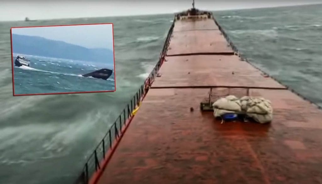 Na videu snimljenom s drugog obližnjeg broda, vidi se trenutak potonuća raspolovljenog broda.