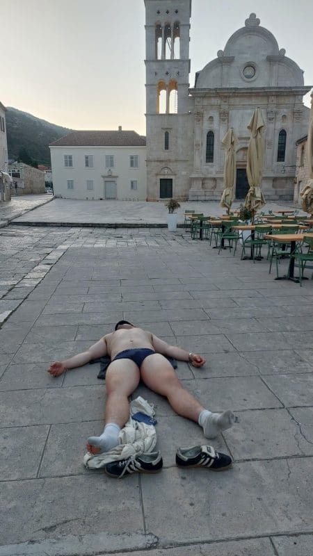 Jutros je društvene mreže zgrozio prizor mladića koji je zoru dočekao spavajući u donjem rubu na Trgu sv. Stjepana, odnosno Pjaci. Čini se da nije mogao izdržati do svog apartmana pa je legao na prvo mjesto koje mu se našlo pri ruci, tj. nozi. I čini se da mu nije tvrdo, ništa ga ne žulja. Ipak, prije negoli je usnuo, skinuo je tenisice, a i većinu odjeće. Pitanje je, je li on možda ispred sebe "vidio" krevet?