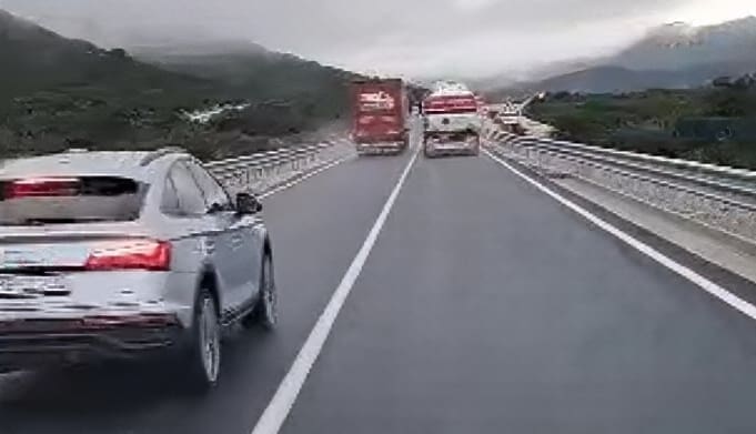 Na videu se prvo vidi kako kamion-tegljač po skliskom kolniku pretječe kamion-cisternu, a potom automobil pretječe drugi automobil iz kojeg je nastala spomenuta snimka. Ne treba ni napominjati da se pretjecanje odvilo na punoj traci, dakle gdje je ono strogo zabranjeno.