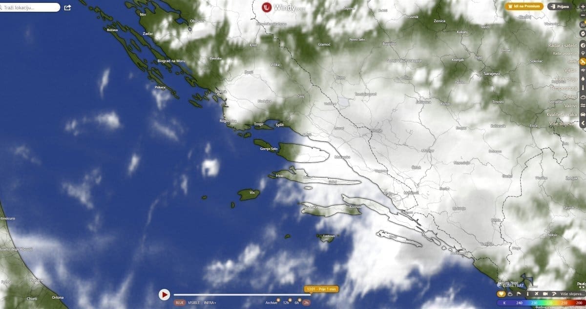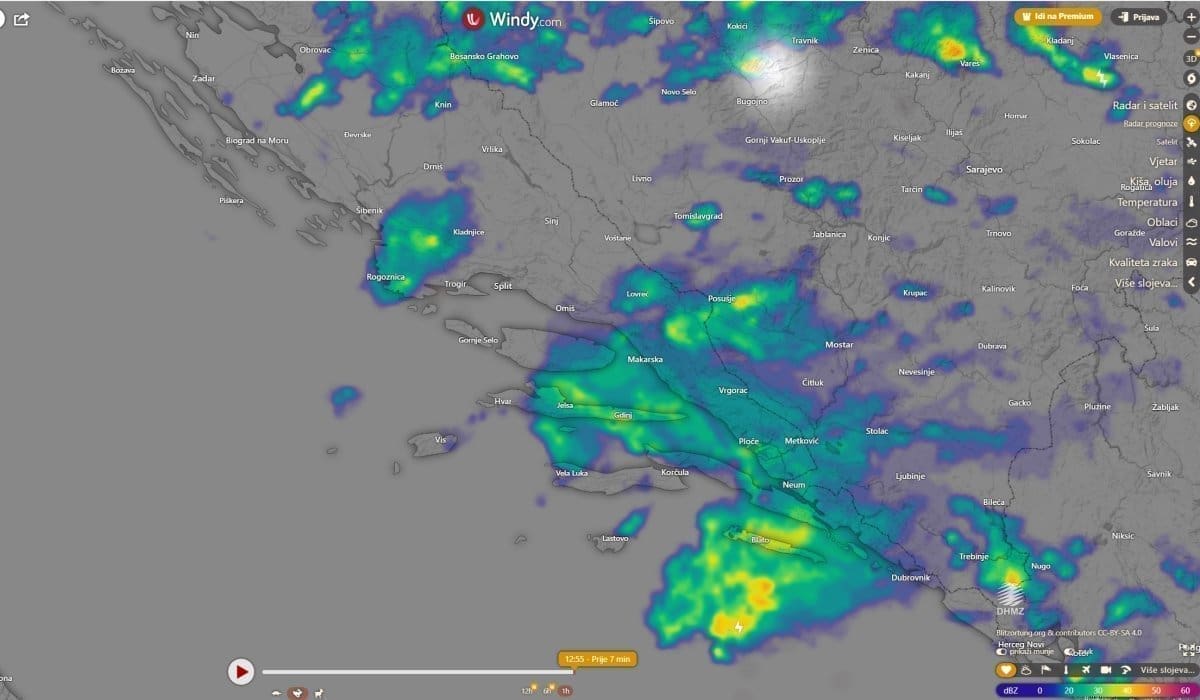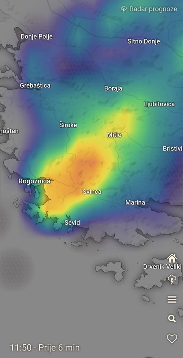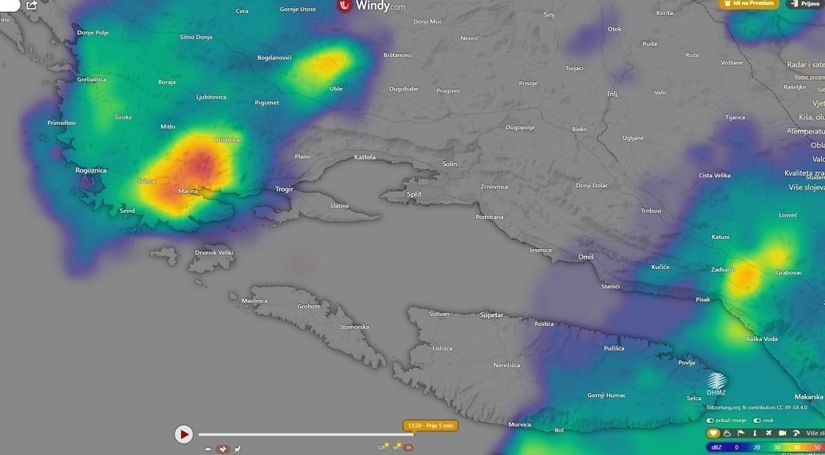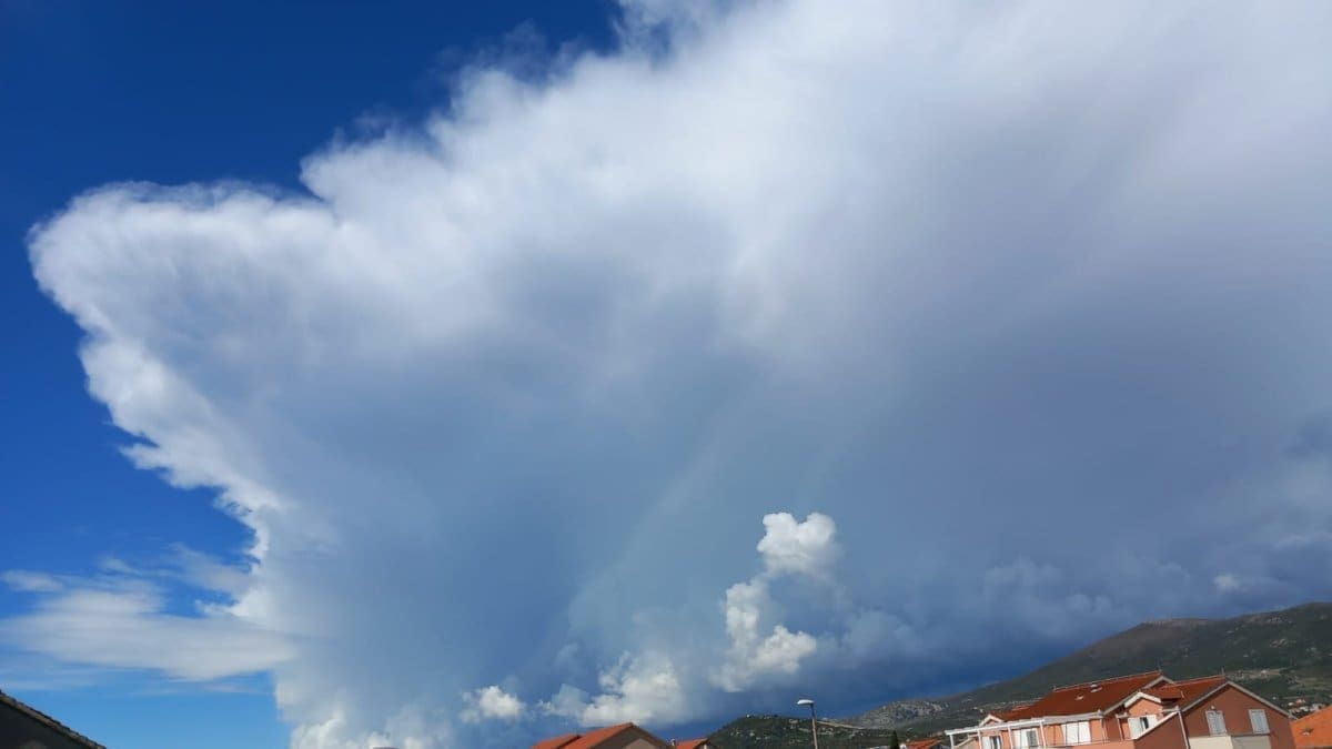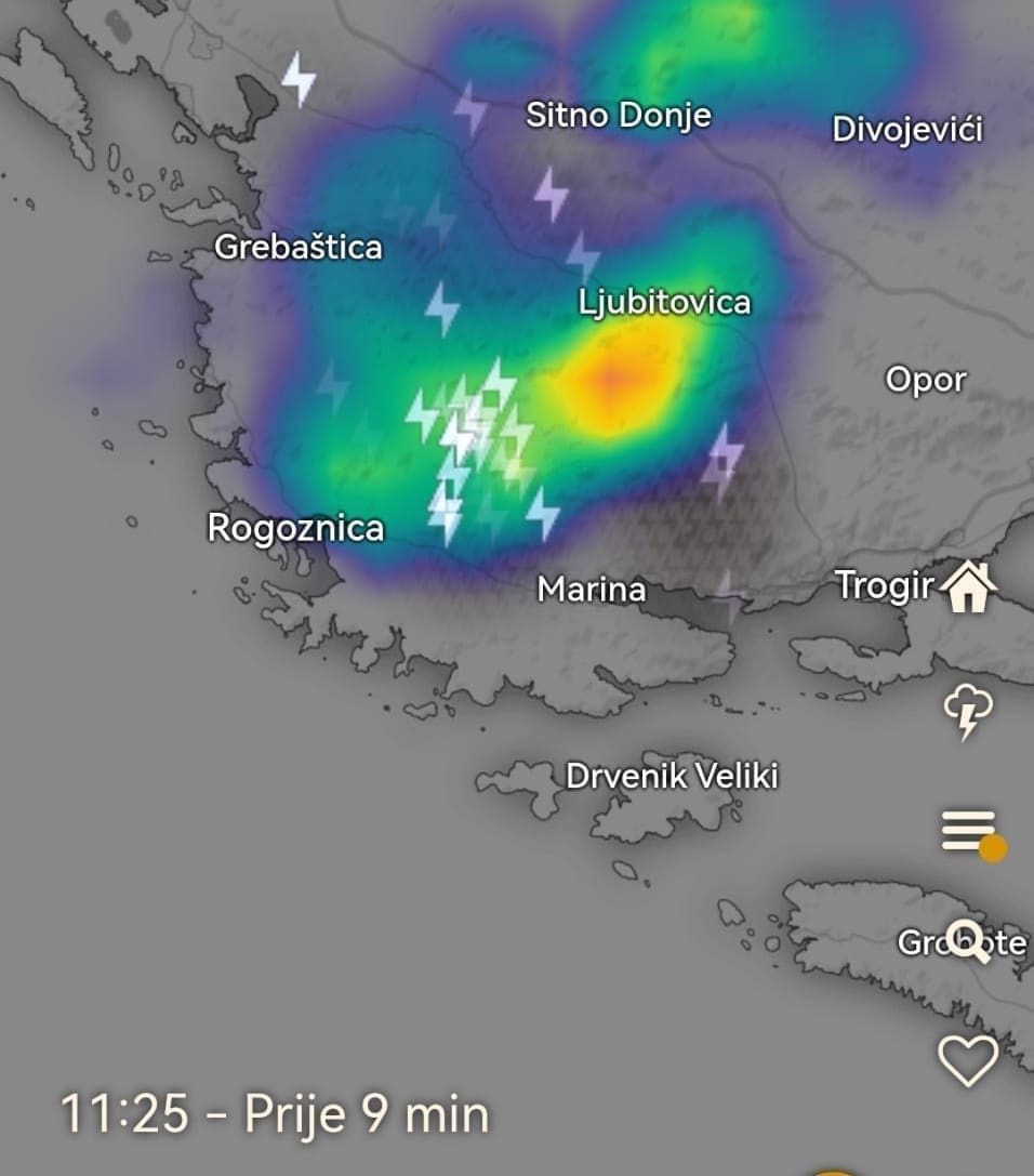 Između 11 i 14 sati olujni oblak razvio se u zaleđu Rogoznice i Marine. Kako doznajemo, neka područja uslijed grmljavinskog nevremena pogodila je jaka tuča, a mjestimice je debljina leda bila oko 10 centimetara.