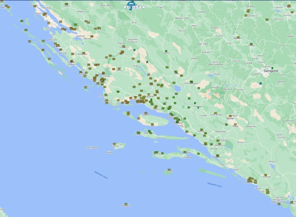 Područja s pljuskovima i tučom imaju znatno nižu temperaturu zraka od onih koja su sunčana. Primjerice, dok Primošten mjeri 11°C i Ljubitovica 9°C, Šibenik i Čiovo su na čak 20°C.