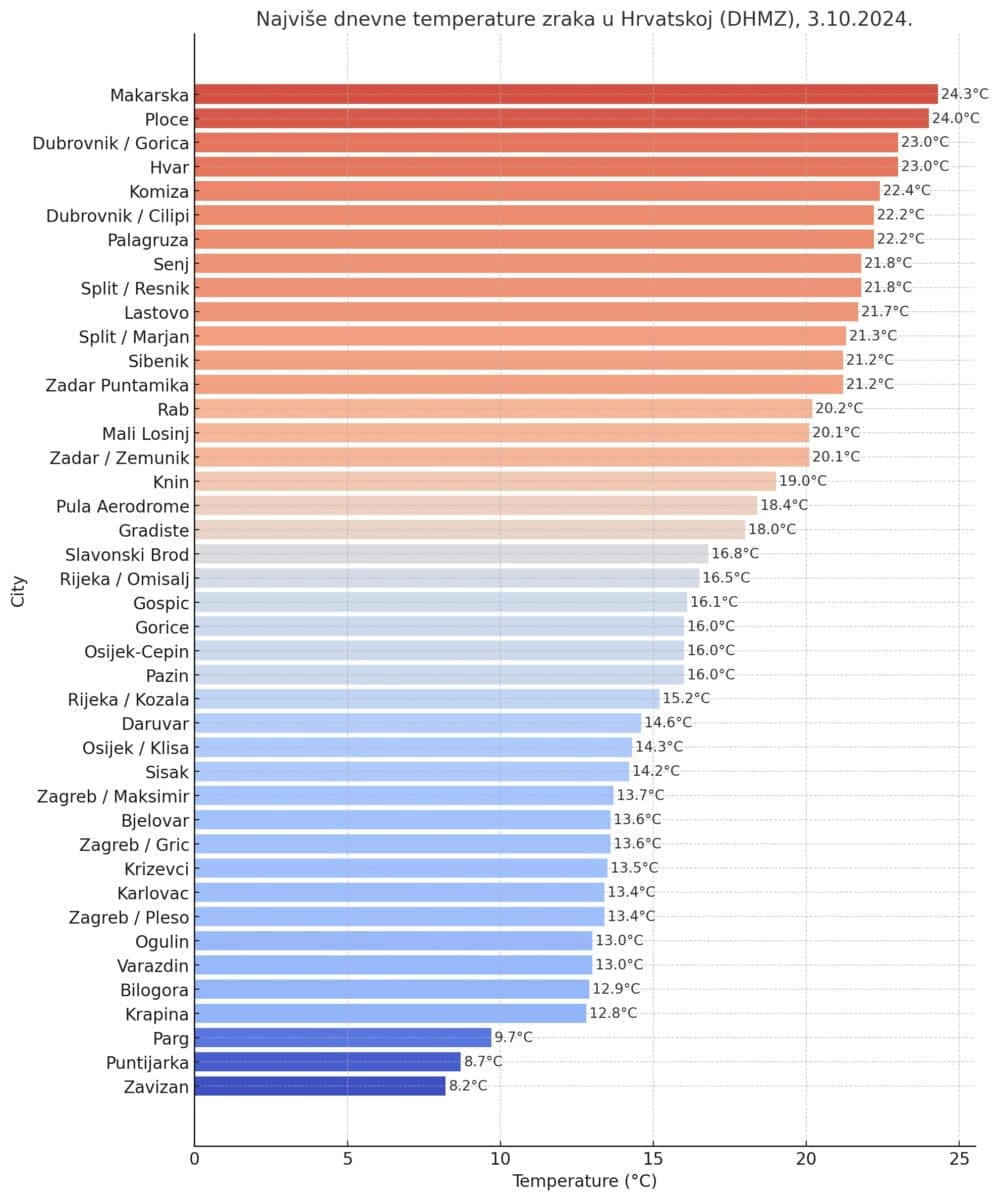 Dalmacija je u četvrtak bila najtopliji dio zemlje, primjerice, u Makarskoj i Pločama najviše dnevne temperature su dosegle 24°C. U Hvaru i Dubrovniku je bilo 23°C, Komiži, Kaštelima i Senju 22 itd. U isto vrijeme u Varaždinu temperature danas nisu prelazile 13°C, a Gorskom kotaru ni 10°C.