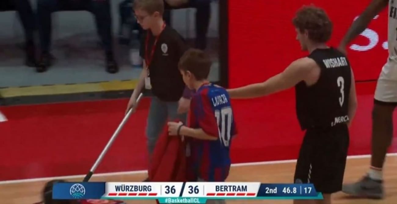 U drugoj četvrtini utakmice domaćeg Würzburga i gostiju iz talijanske Tortone (80:79) kamere su uhvatile kako jedan od dva dečka koji brišu parket nosi najprodavaniji dres u Hrvatskoj.