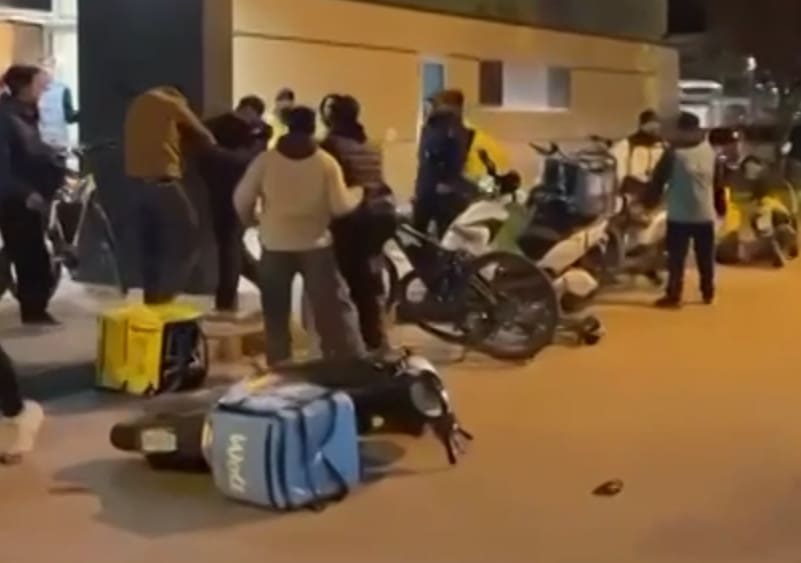 Na snimci koja se ubrzano širi društvenim mrežama prikazano je dvadesetak dostavljača u sukobu, koristeći šake i kacige, dok je jedan motocikl završio na podu tijekom žestoke tučnjave.