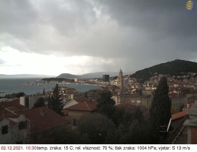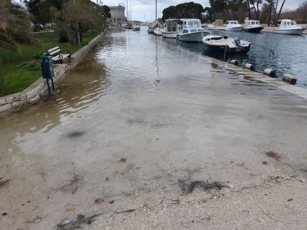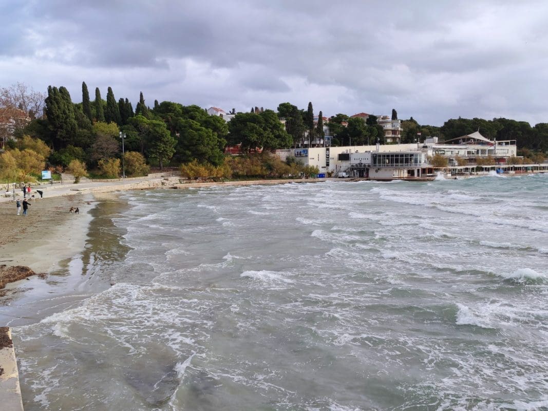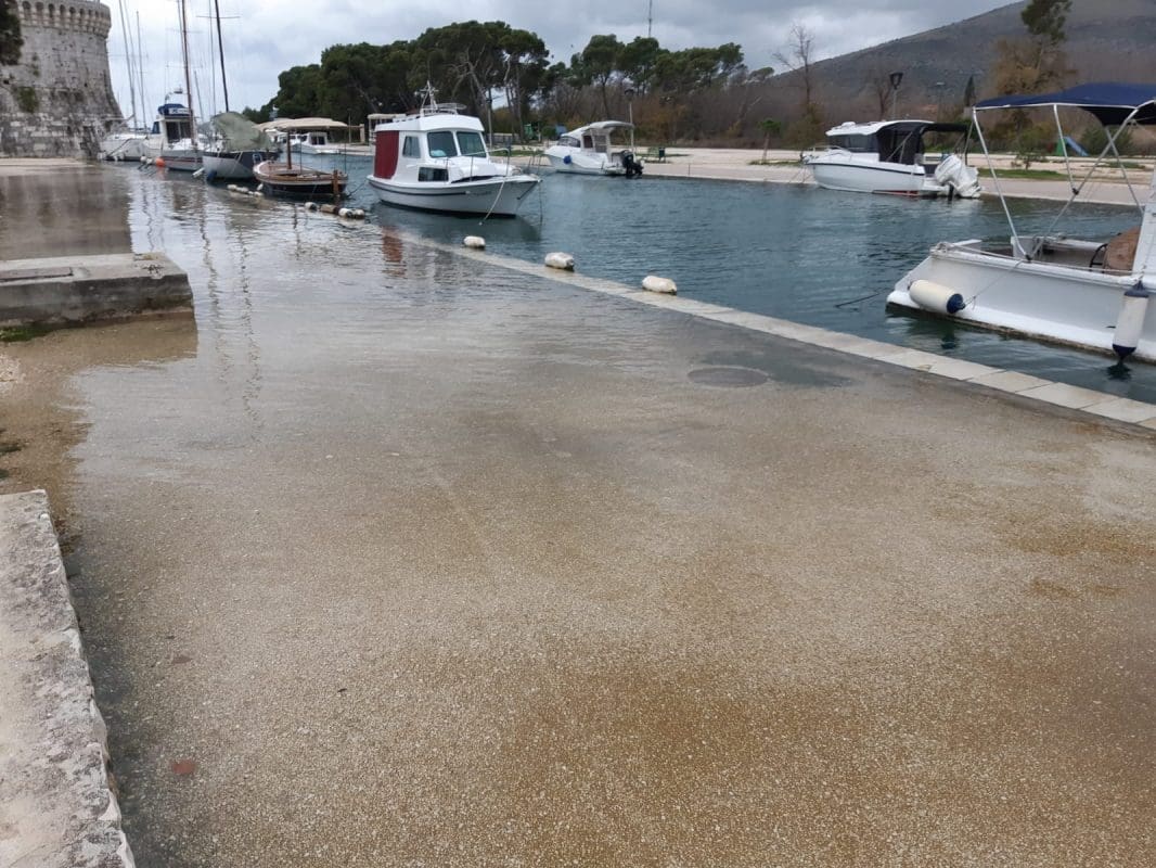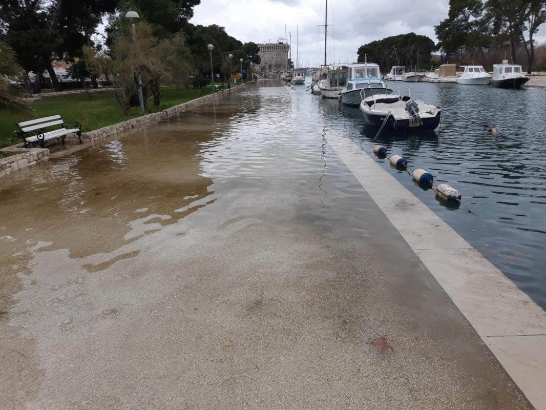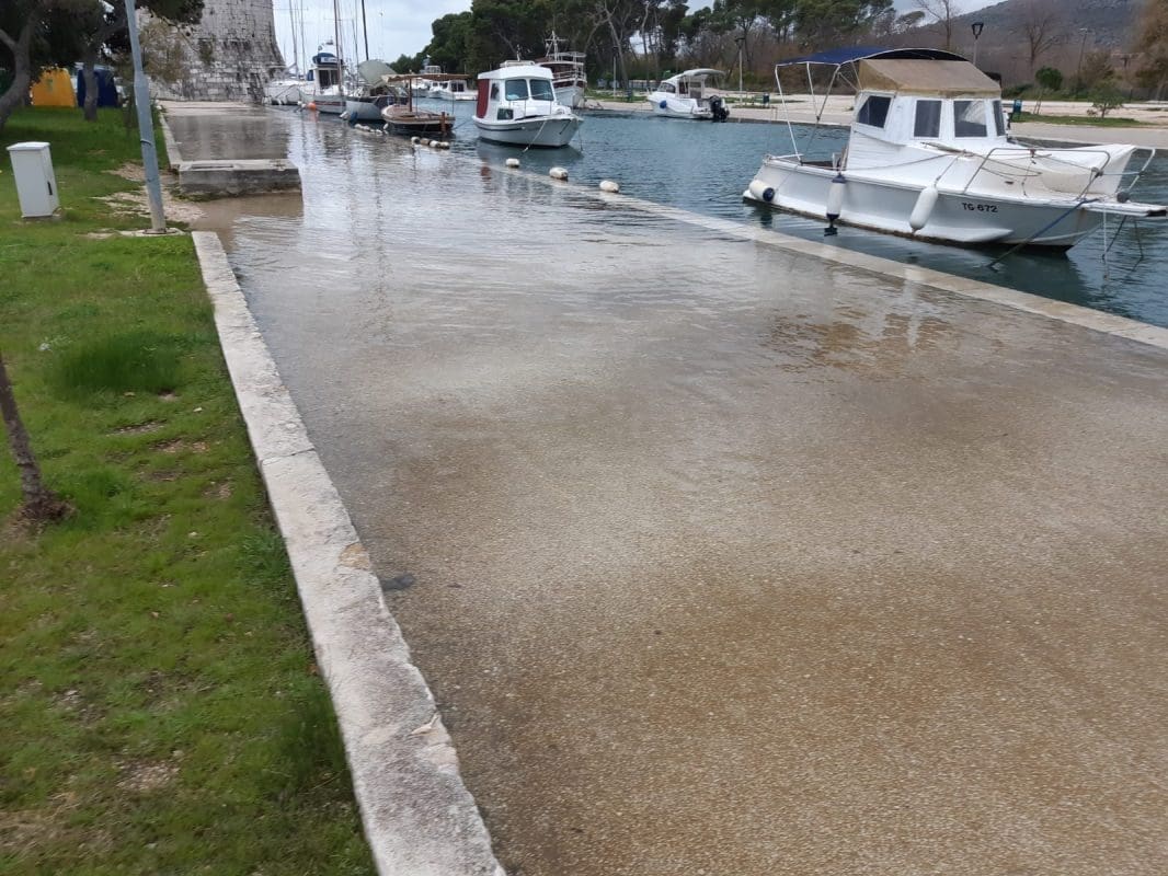 Na dijelu obale, osobito u Trogiru, nastupila je još jedna ciklonalna plima. Vrhunac vjetra očekuje se večeras kada bi udari vjetra mogli dosezati 100 km/h, a tada se očekuju i najobilniji pljuskovi. Oborine će stati do petka ujutro, a zapuhat će umjerena do pojačana bura koja će podno Velebita biti olujna s orkanskim udarima. Sutra će umjereno zahladiti.