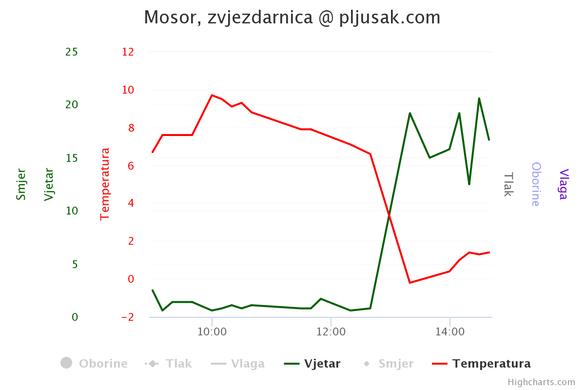 Veljača - prevrtljača, pučki je opis klimatoloških obilježja veljače koji se danas još jednom potvrdio. Dok su noć i jutro donijeli južinu i natprosječnu toplinu, popodne je uz hladnu frontu donijelo nagli i izraženi pad temperature zraka, nevrijeme, tuču, snijeg i olujnu buru.