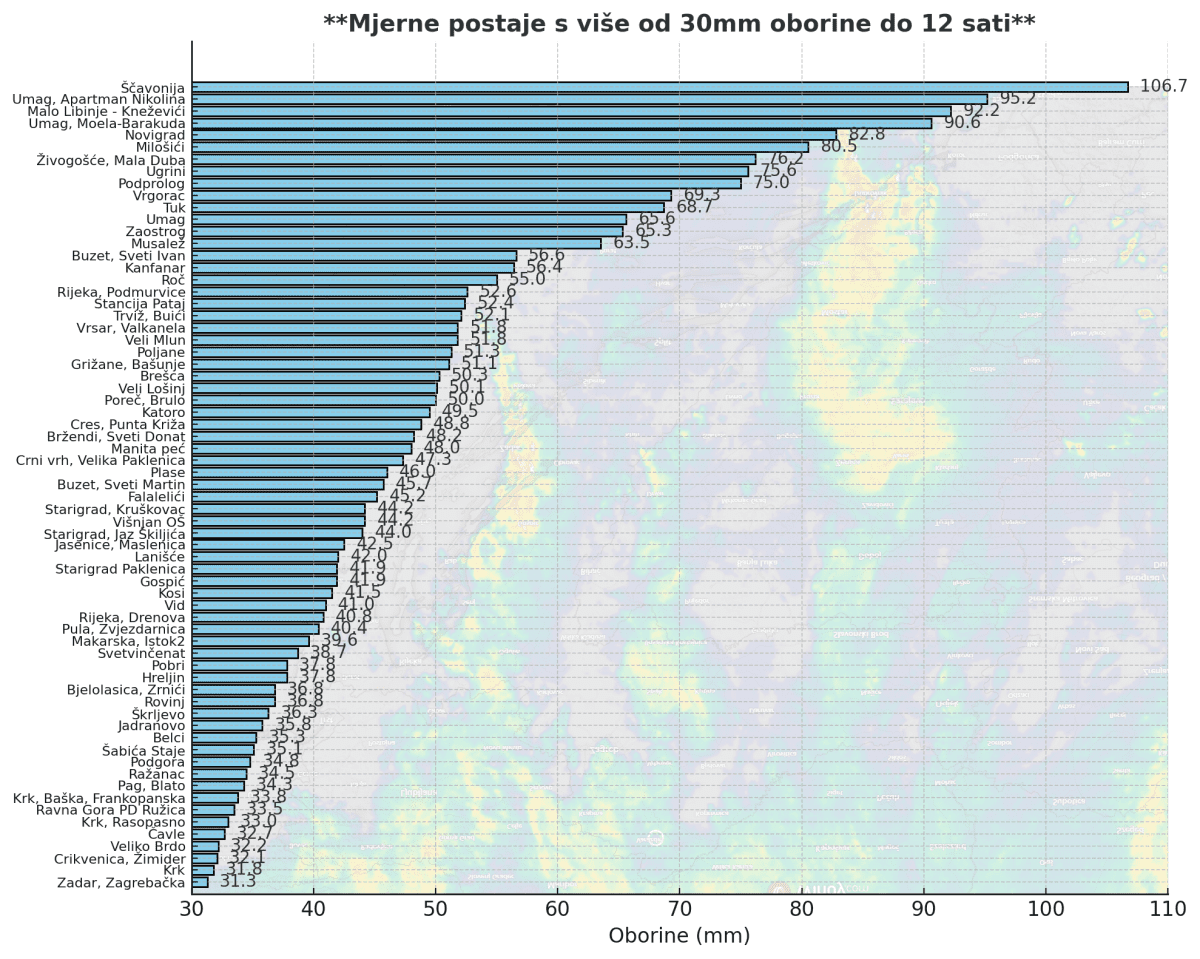 Uz sjeverozapadnu Istru oborinski se još ističe dio Gorskog kotara, područje južnog Velebita, ali i Zabiokovlje. Primjerice, na vrgoračkom području palo je 60 do 80 mm oborina do 12 sati, a 40-ak mm u Makarskoj u kratko vrijeme bilo je dovoljno za bujice gradskim prometnicama.