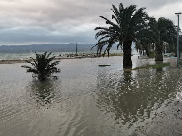 Nizak tlak i lunarna plima uz olujan i orkanski vjetar južnog i jugozapadnog smjera uzrokovali su rast razine mora pa je veći dio Omiša završio poplavljen.