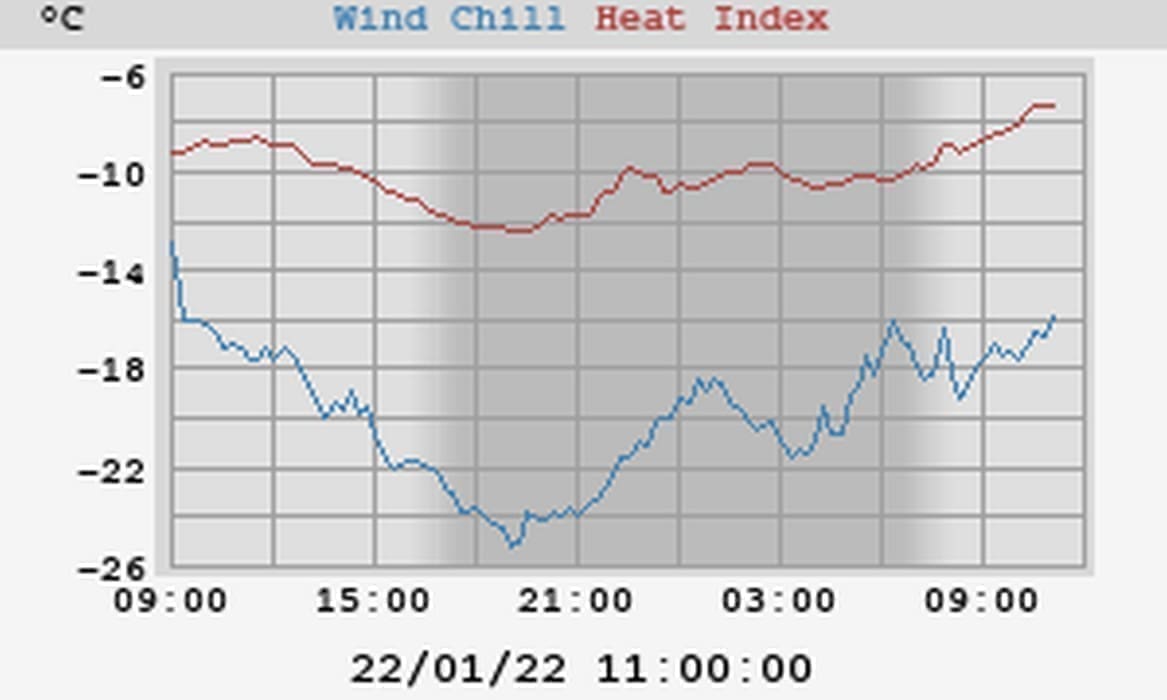 Subotnje jutro bilo je najhladnije u dosadašnjem tijeku siječnja. Diljem Dalmatinske zagore minimalne vrijednosti temperature zraka bile su niže od 0 stupnjeva, a ponegdje su padale ispod -5°C. Najhladnije je bilo u planinama. Na Svetom Juri na Biokovu izmjereno je -12°C, a na Sinjalu na Dinari -13°C. Mjerna postaja na Velikoj Duvjakuši na Dinari noćas je mjerila -11°C uz osjet hladnoće od čak -26°C zbog jake bure.