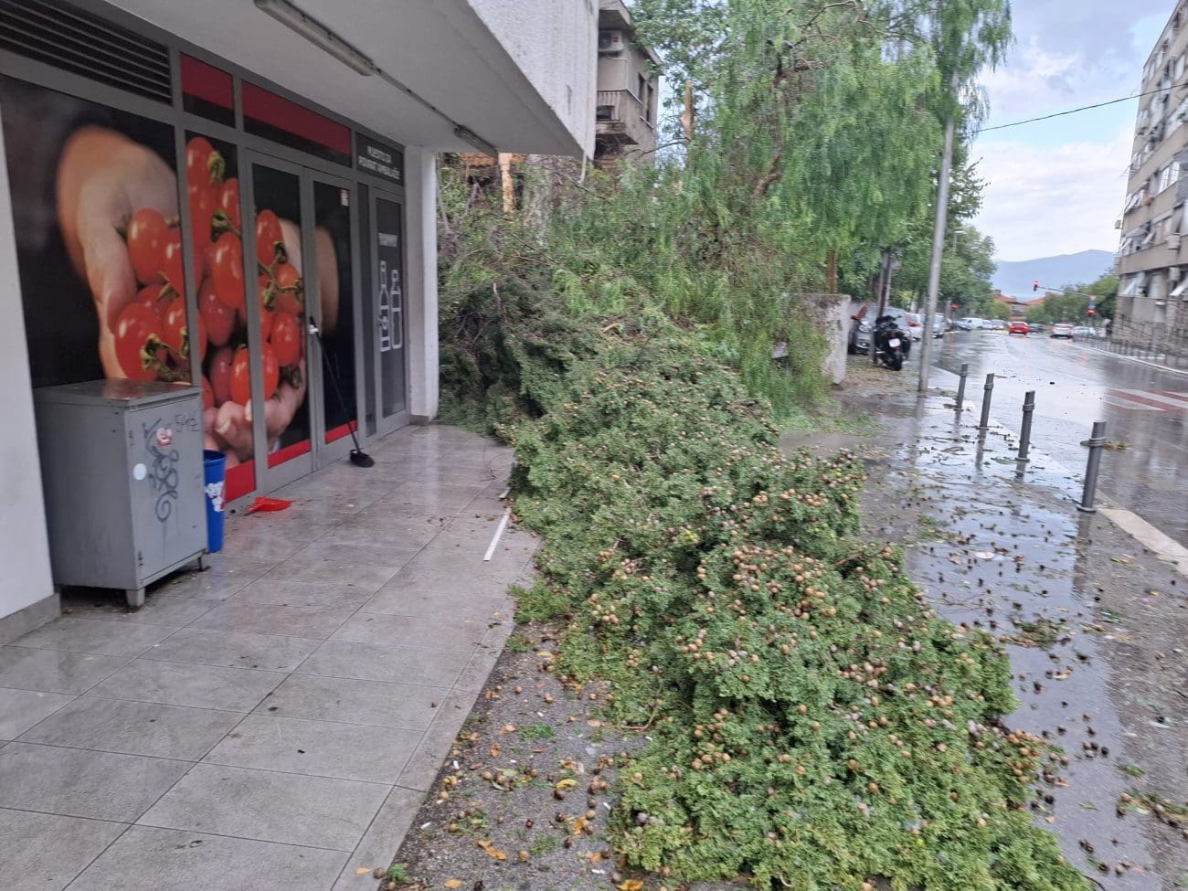 Vatrogasci su neprestano na terenu, obilaze grad, uklanjaju stabla i interveniraju na lokacijama gdje su grane, kontejneri i građevinski materijal završili na cesti. Promet je u više dijelova grada gotovo paraliziran.