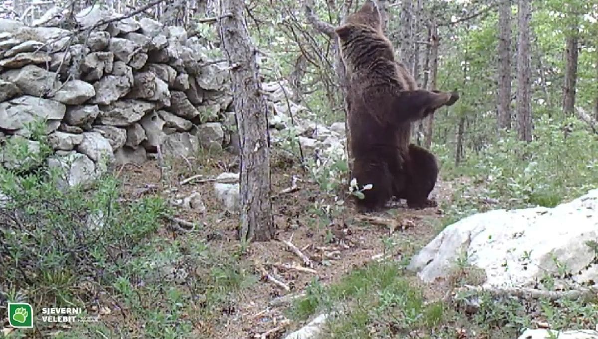 Prije nekoliko mjeseci na službenoj stranici Nacionalnog parka Sjeverni Velebit objavljena je snimka mladih medvjeda u igri, a sada je na istom mjestu "uhvaćen" veliki medvjed. Na snimci se vidi kako se češe o stablo, a kada se ispravi zaista je ogroman.