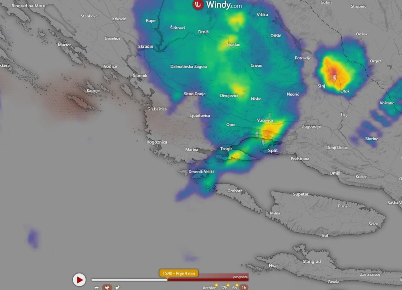 Oko 15:30 neverin je zahvatio središnji dio Kaštela, Čiovo te se sasvim približio splitskom poluotoku. Jače grmljavinsko nevrijeme razvilo se između Hrvaca i Gljeva.