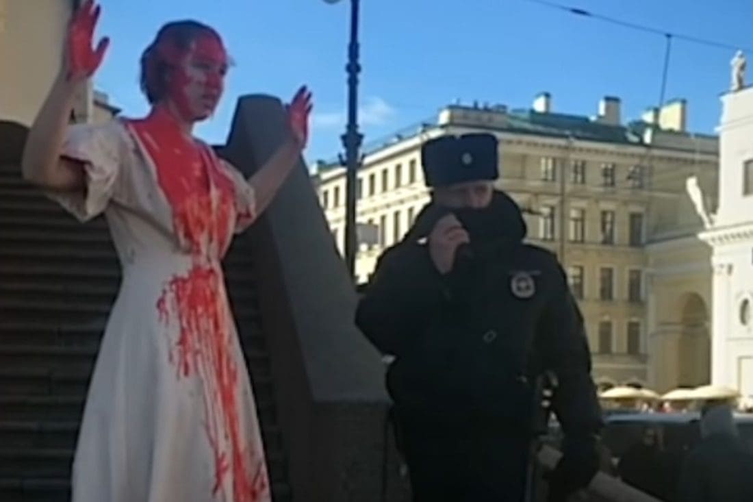 Ruska umjetnica Jevgenija Isajeva oblila se lažnom krvlju i ponavljala frazu "moje srce krvari" na prosvjedu u Sankt Peterburgu u nedjelju.