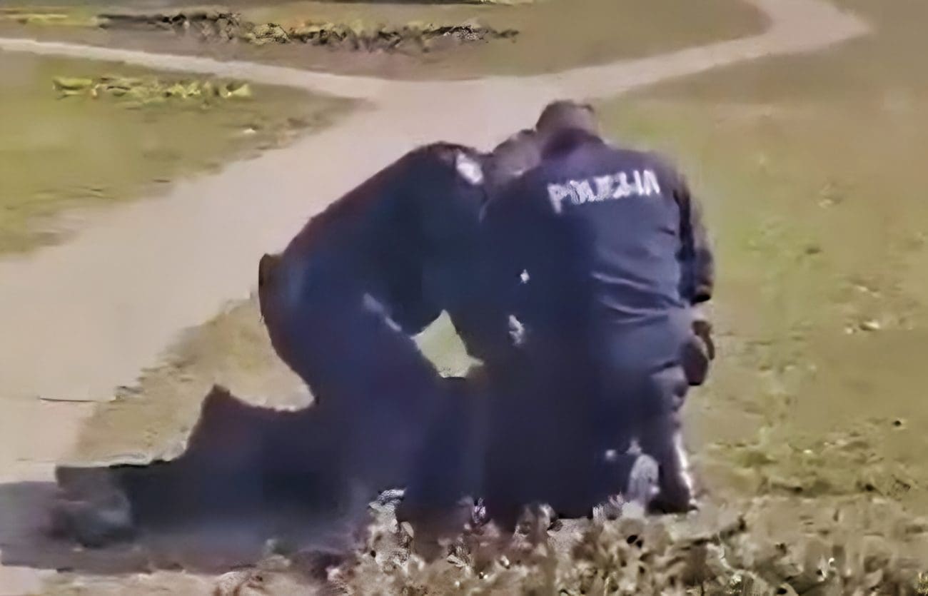 Na snimci, koju je objavio portal Telegram, vidi se kako starija žena odjevena u pončo sa slamnatim šeširom na glavi pokušava pomoći svojoj kćeri (49) koju je policija srušila na obližnji travnjak, pokušavajući joj silom staviti lisice na ruke.