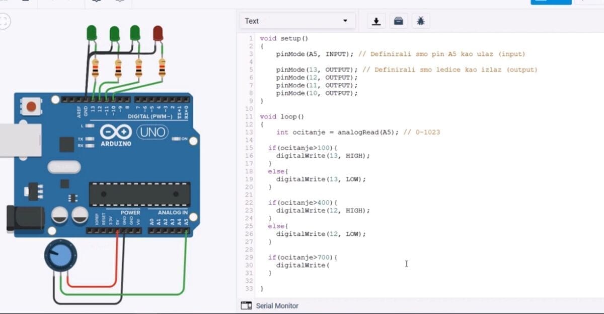 U današnjem videu ćemo pokazati što je to potenciometar i kako ovisno o položaju potenciometra možemo paliti određene LED (svjetlosne diode). Uz to ćete naučiti i neke nove naredbe koje će biti potrebne za daljnje projekte. Sve što vam treba za uspješno svladavanje gradiva opisanog u ovom videu jest besplatni online alat Tinkercad (www.Tinkercad.com).