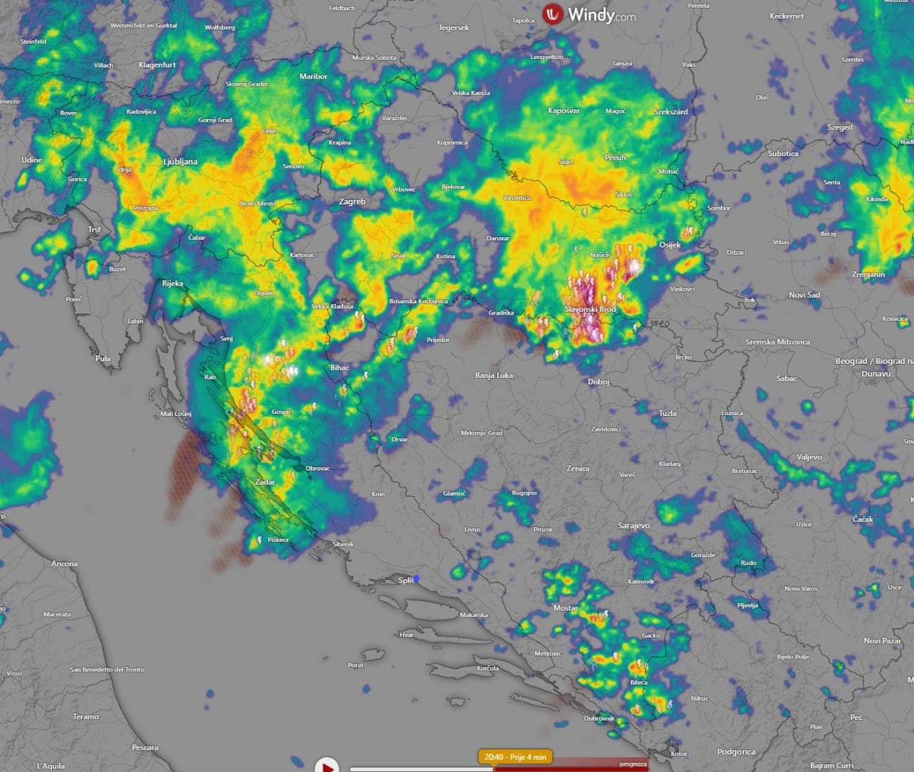 U ranim večernjim satima grmljavinsko nevrijeme zahvatilo je krajnji sjever Dalmacije te se postupno širi na zadarsko područje. Dio toga sustava spustit će se do srednje Dalmacije.