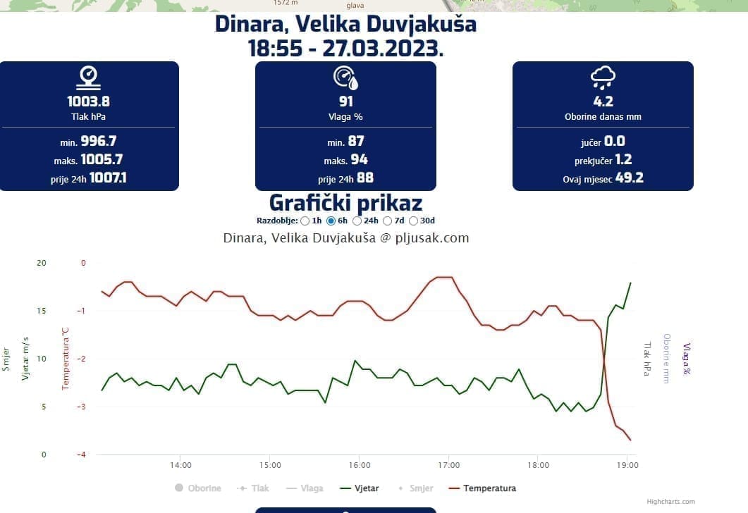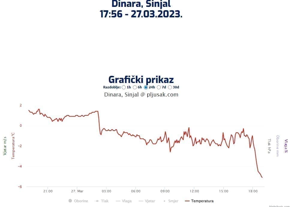 Na Sinjalu, najvišem vrhu Hrvatske, temperatura je pala na -5°C. Na Velikoj Duvjakuši na Dinari pada snijeg uz -4°C i osjet hladnoće od -14°C.
