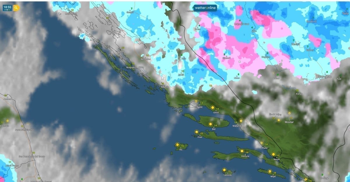 Krajem dana oborine su zahvatile dijelove Dalmacije. Radi se uglavnom o slaboj kiši, no u planinama pada snijeg.