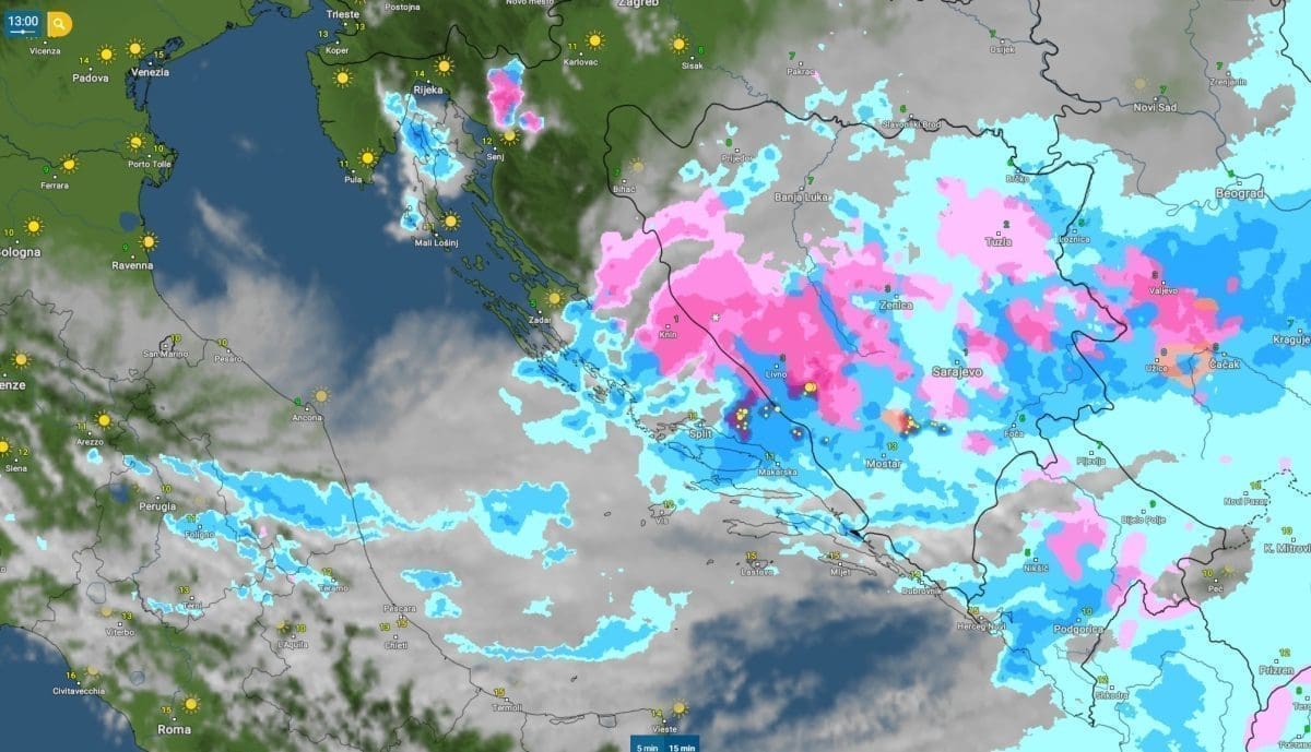 Fronta brzo napreduje prema jugu Dalmacije, trenutno je nevrijeme pred Makarskom. Sjeverni Jadran i sjevernu Dalmaciju već je zahvatilo razvedravanje koje će se do kraja dana proširiti na cijeli Jadran.