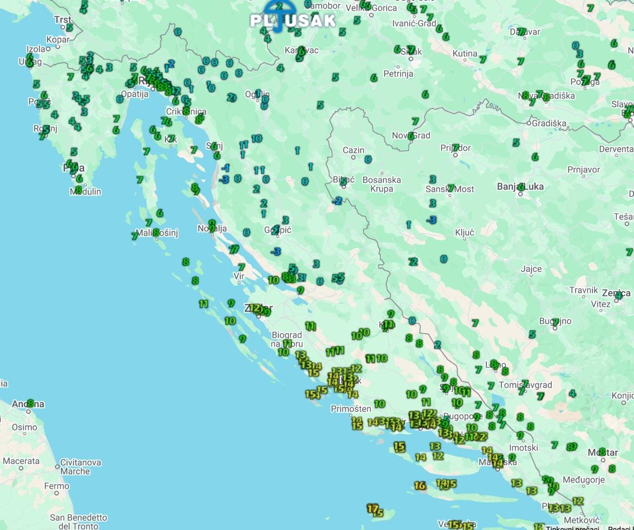 Fronta je na Jadranu stigla do zadarskog područja gdje se očekuje naglo jačanje bure. Radar i trenutne temperature zraka pogledajte u nastavku: