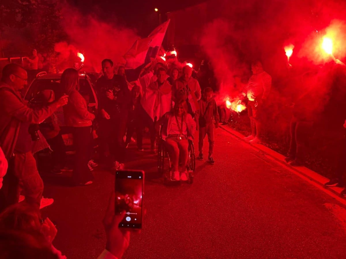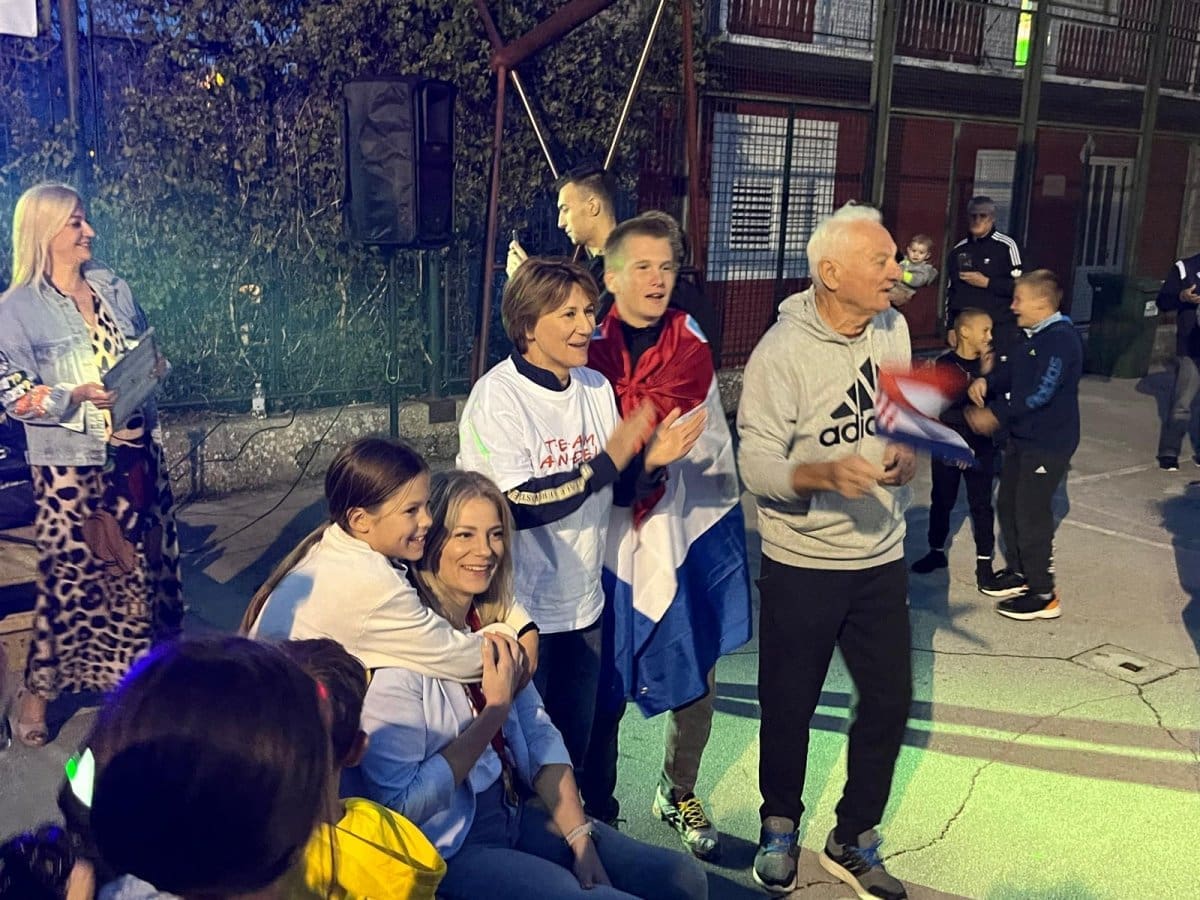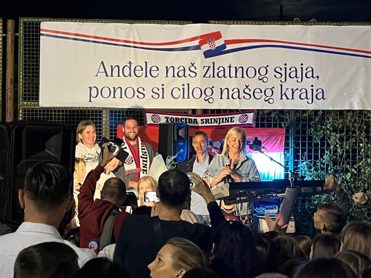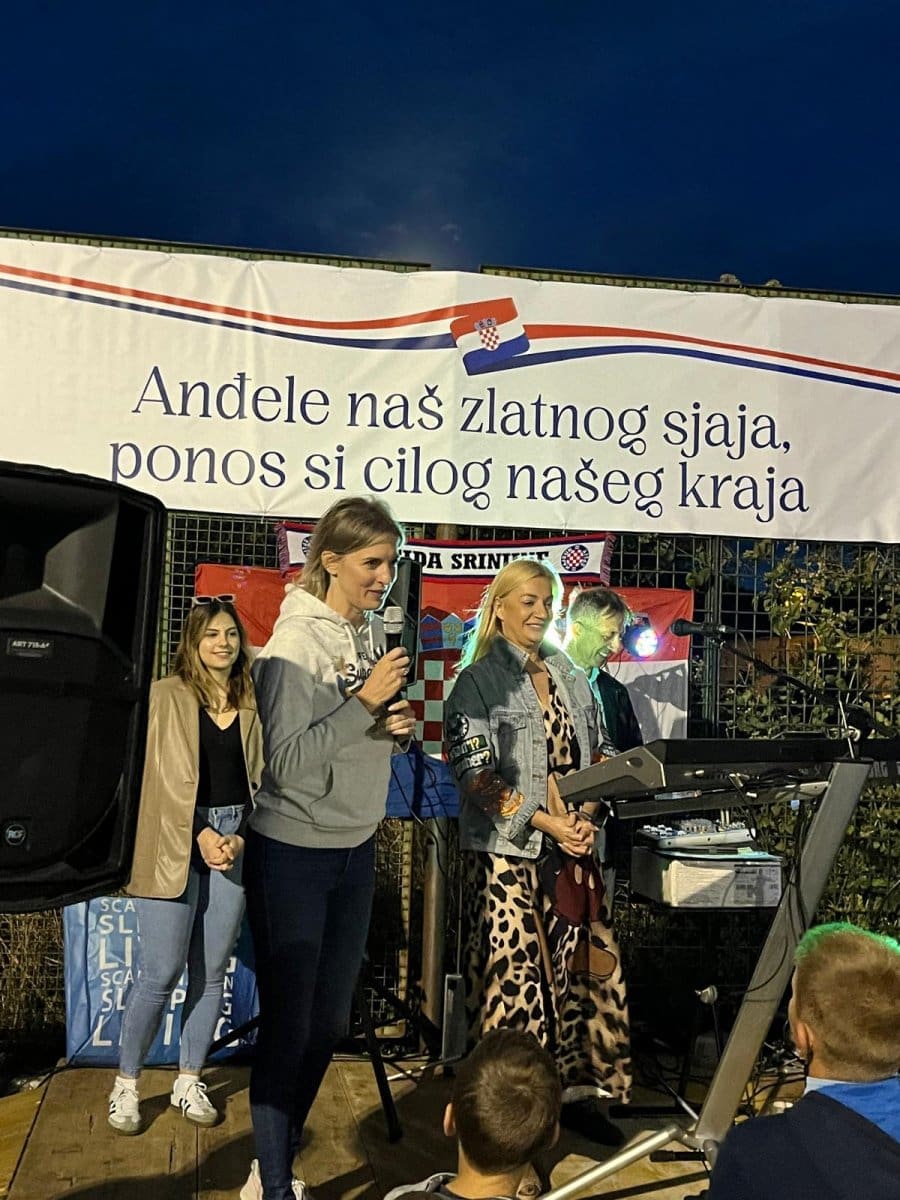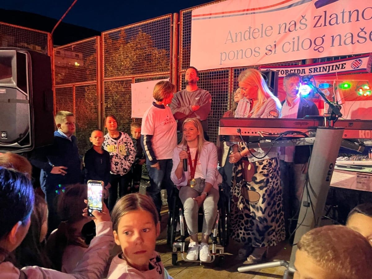 Cijelo mjesto i gosti pozdravili su zlatnu Anđelu, kao i paraolimpijca Luku Bakovića, koji je također stigao iz Pariza okićen medaljom. Među onima koji su pozdravili Anđelu, koja je pustila suze radosnice, i Luku, bili su i zamjenik župana SDŽ Stipe Čogelja, njezina rođakinja i državna tajnica Zrinka Mužinić Bikić, saborski zastupnik Tomislav Šuta, a posebne riječi zahvale uputio je župnik Blažene Djevice Marije u Srinjinama, don Tomislav Čubelić.