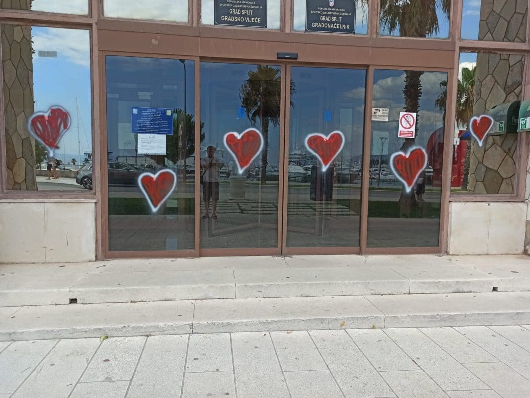 Crvena srca osvanula su na ulaznica vratima splitske Gradske uprave Banovine. Prije nekoliko dana ovaj performans su najavili iz Građanske inicijative "Gist". Sada su očito odlučili napraviti ono što su i najavili. Detalje je otkrio Dalibor Popovič iz inicijative.