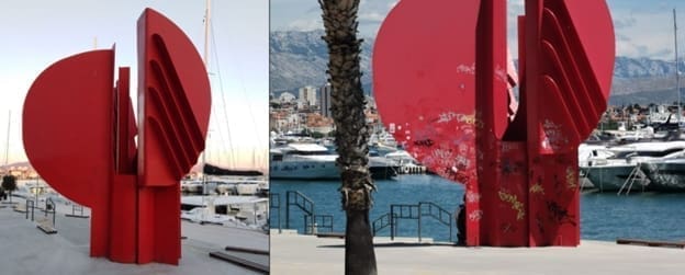 Kad bi smo, na primjer, kojim slučajem sprejem pišali po Grguru Ninskom, ili na sličan način nakazili peristilsku sfingu, banovinski upravljači i njihovi istomišljenici iz Konzervatorskog odjela svakako bi to proglasili kulturocidom i primjereno reagirali. Barem se nadamo! Pa što ih onda sprečava da se na isti način odnose i prema svim drugim umjetničkim i spomeničkim objektima u ovome gradu, umjesto što svojom indolencijom zapravo potiču njihovu devastaciju?