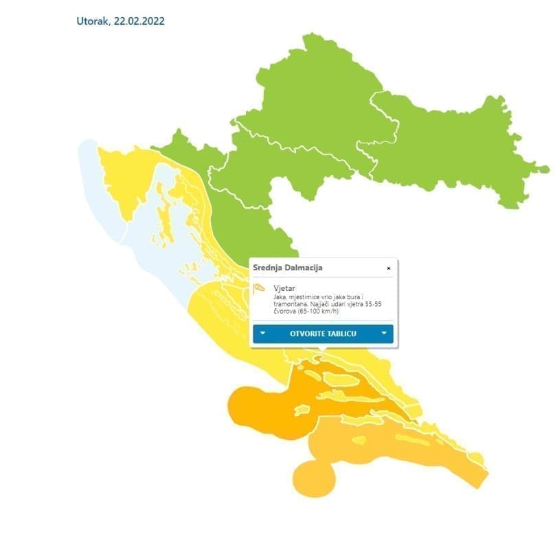 DHMZ je, unutar sustava MeteoAlarm, izdao za srednju Dalmaciju narančasti stupanj upozorenja i to zbog olujne bure.